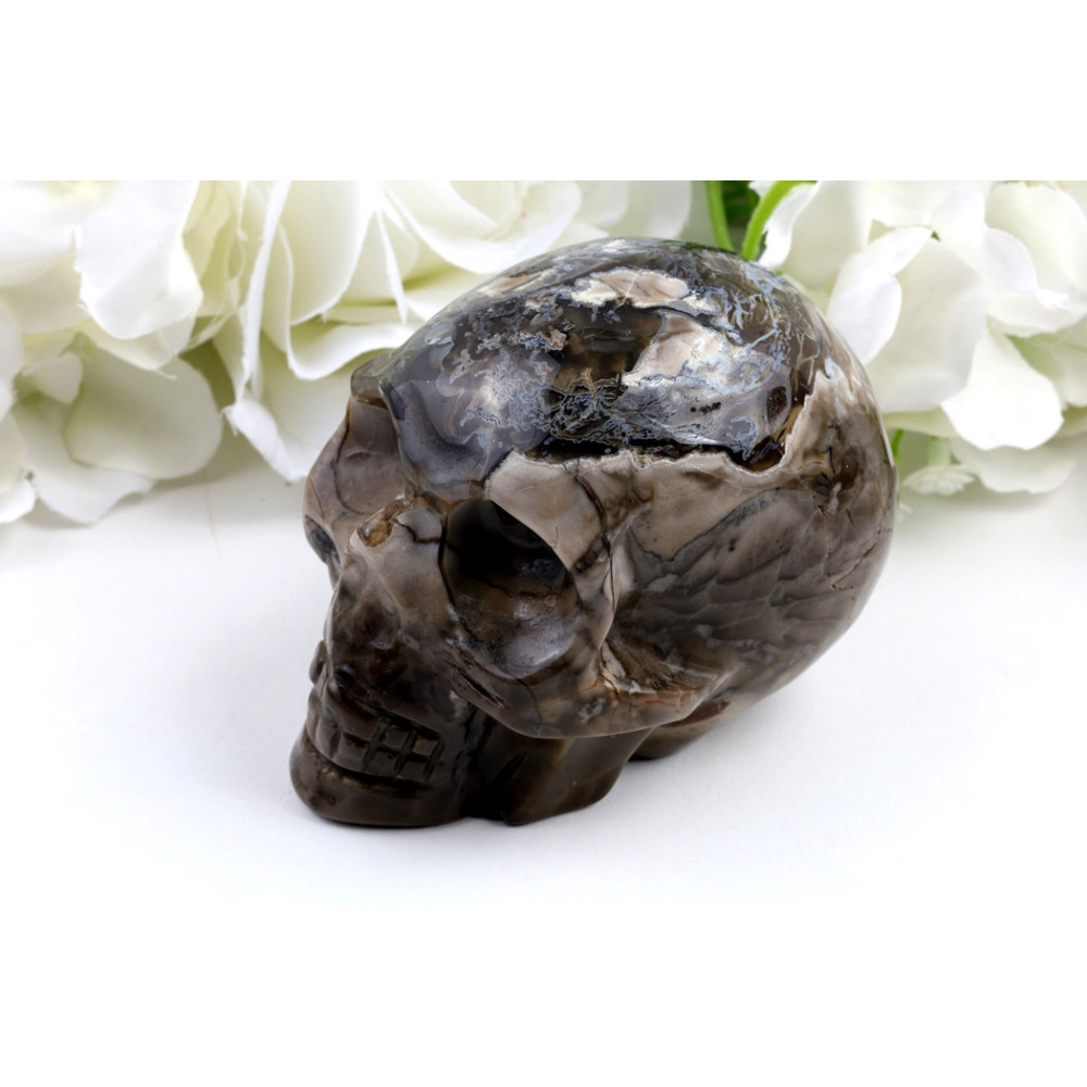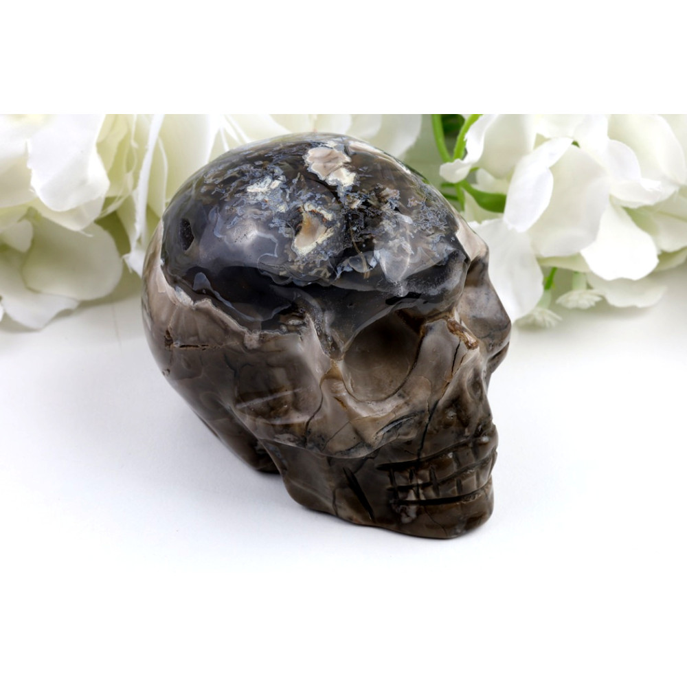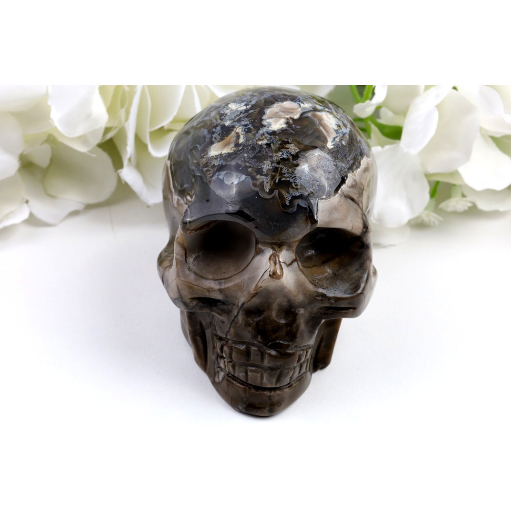 Tato nádherná lebka z achátu k nám přicestovala z daleké Číny, země s bohatou historií těžby a opracování minerálů. Achát se zde formoval miliony let hluboko v zemi, kde pod vlivem tlaku a minerálů vznikaly jeho charakteristické vrstvy a barvy. Každý kus achátu vypráví svůj vlastní příběh o zemských procesech, a tato lebka je zhmotněním této pradávné energie a umění přírody.