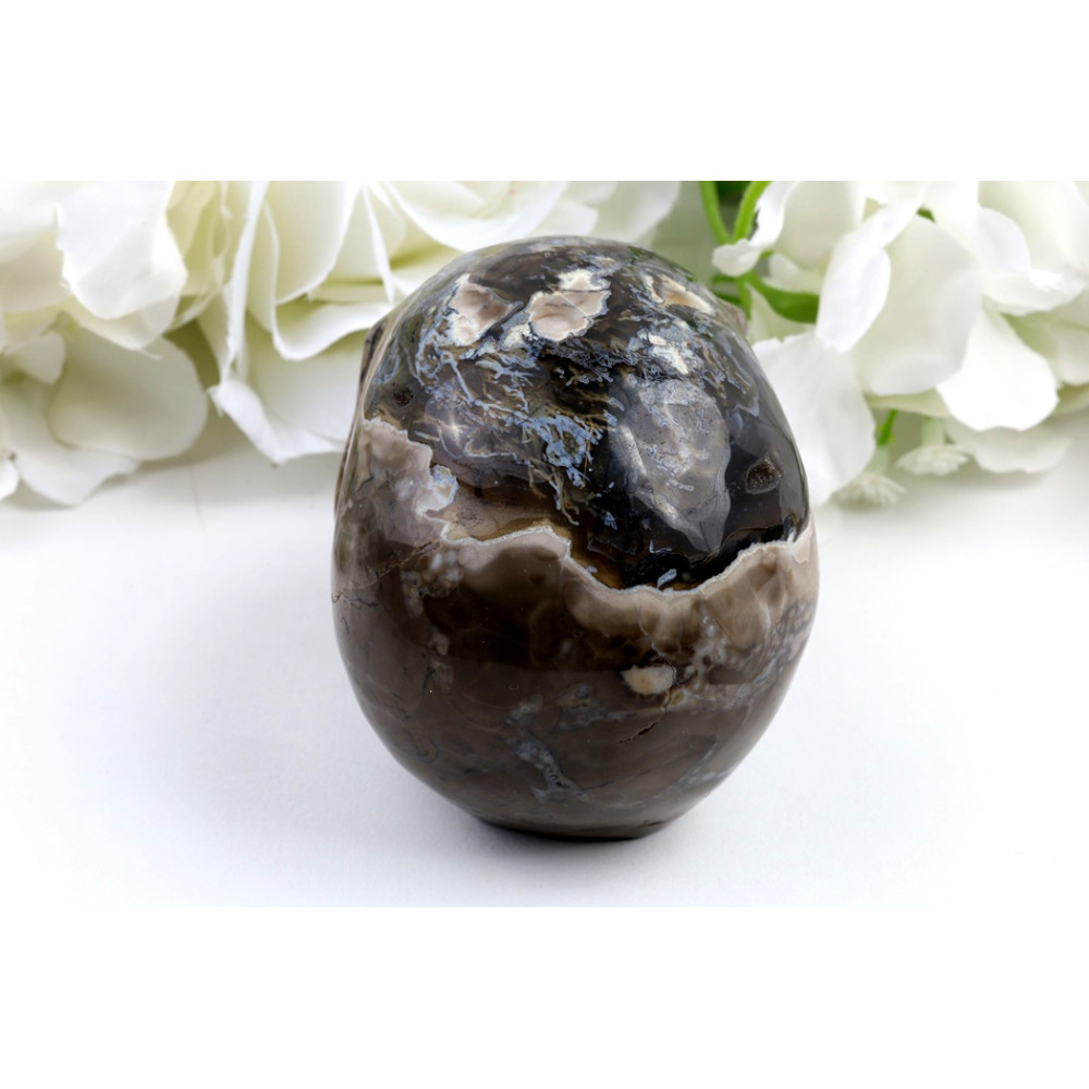 Představujeme vám fascinující lebku z fluorescenčního achátu, která je skutečným uměleckým dílem přírody i lidské práce. Tento konkrétní kus nese odstíny převážně tmavě hnědé, šedé a krémové, doplněné o bílé a světlejší vrstvy, které tvoří typickou, vlnitou kresbu achátu. Povrch lebky je hladce leštěný, což podtrhuje jeho přirozený lesk a odhaluje jemné detaily vnitřní struktury. Na některých místech můžete pozorovat průsvitné inkluze, které dodávají kameni hloubku a jedinečný charakter. Pod UV světlem se očekává, že achát odhalí svou skrytou fluorescenci, což z něj činí nejen krásný, ale i překvapivý dekorační kámen a originální sběratelský kousek.