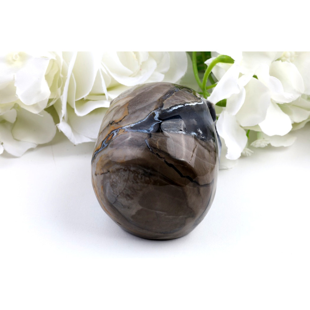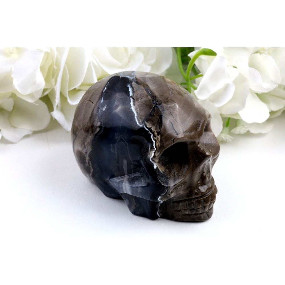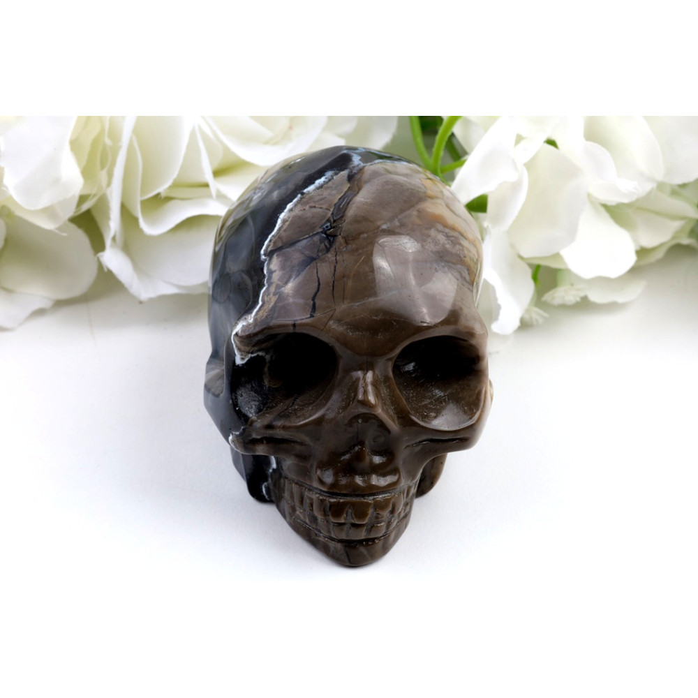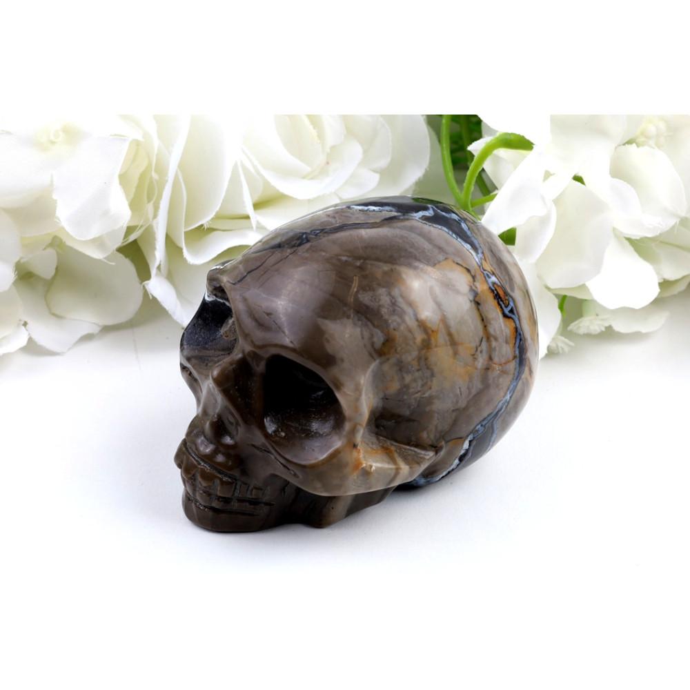 Před vámi leží fascinující lebka, mistrně vytesaná z fluorescenčního achátu. Její povrch se leskne s vysokým leštěním, které zvýrazňuje hluboké, převážně tmavě hnědé a zemité tóny, proložené nádhernými bílými, krémovými a světle hnědými pruhy. Tyto přírodní vzory vytvářejí dojem žilkování a prasklin, které dodávají kusu starobylý a mystický charakter. Kresba je dynamická a unikátní na každé straně, nikde se neopakuje. Každý detail lebky – od očních jamek po zuby – je precizně zpracován, což svědčí o zručnosti řezbáře. Je to skutečně jedinečný kousek, který pod UV světlem odhalí svou skrytou krásu.
