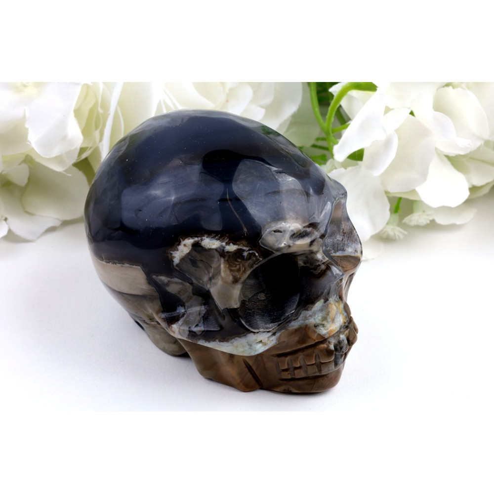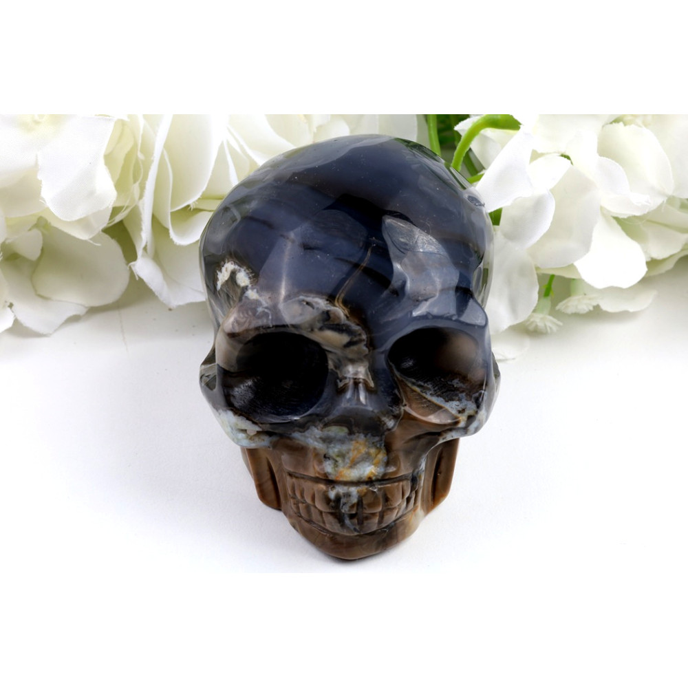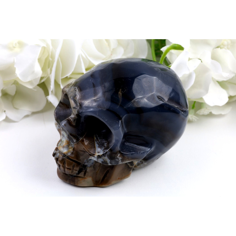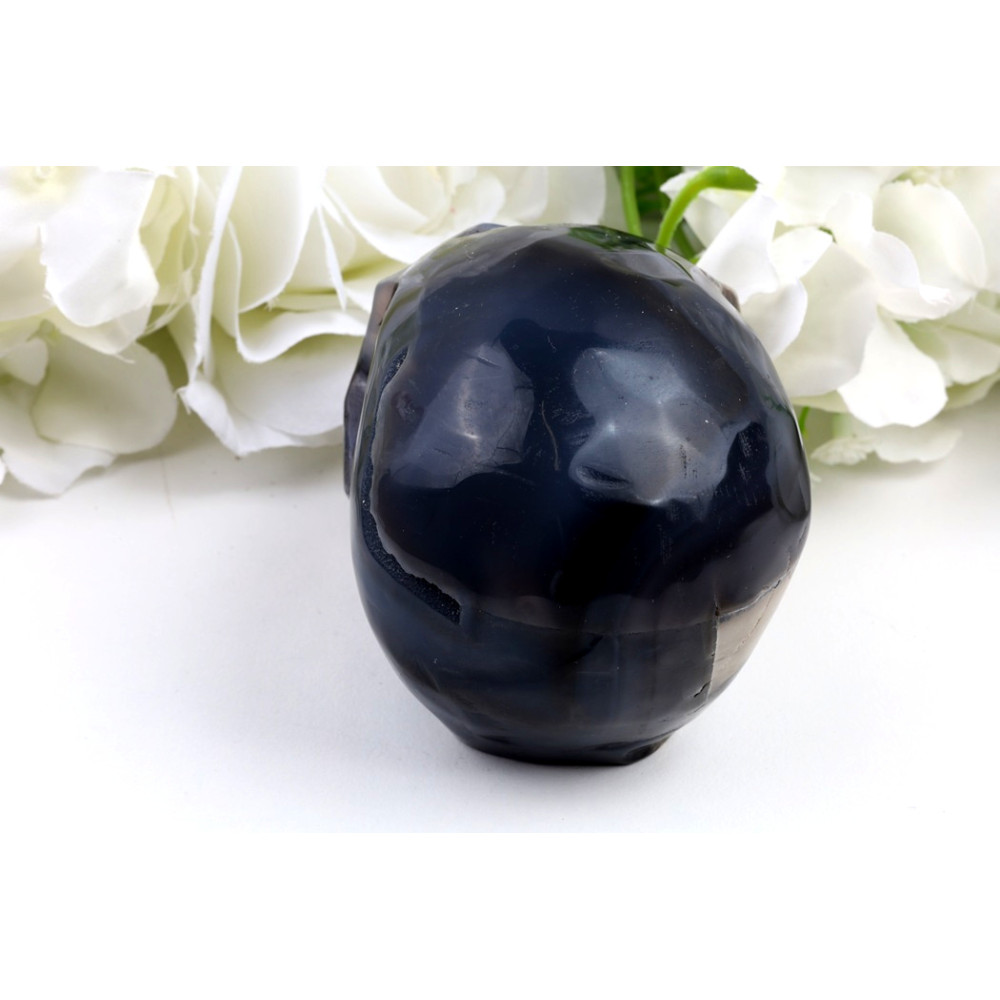 Tato nádherná lebka je mistrným dílem přírody i řemesla. Horní část lebky se pyšní sytě tmavomodrými až téměř černými tóny, které přechází do jemných, zemitých odstínů hnědé a béžové v oblasti čelisti a spánků. Celý povrch je dokonale leštěný a nabízí zrcadlový lesk, který zvýrazňuje organické páskování typické pro acháty. Kolem očních jamek a na spodní části lebky si všimnete krásných krémových inkluzí a jemných žilek, které dodávají kusu jedinečný charakter a hloubku. Je to skutečně originální kus, který upoutá pozornost a v UV světle odhalí své fascinující fluorescenční vlastnosti.