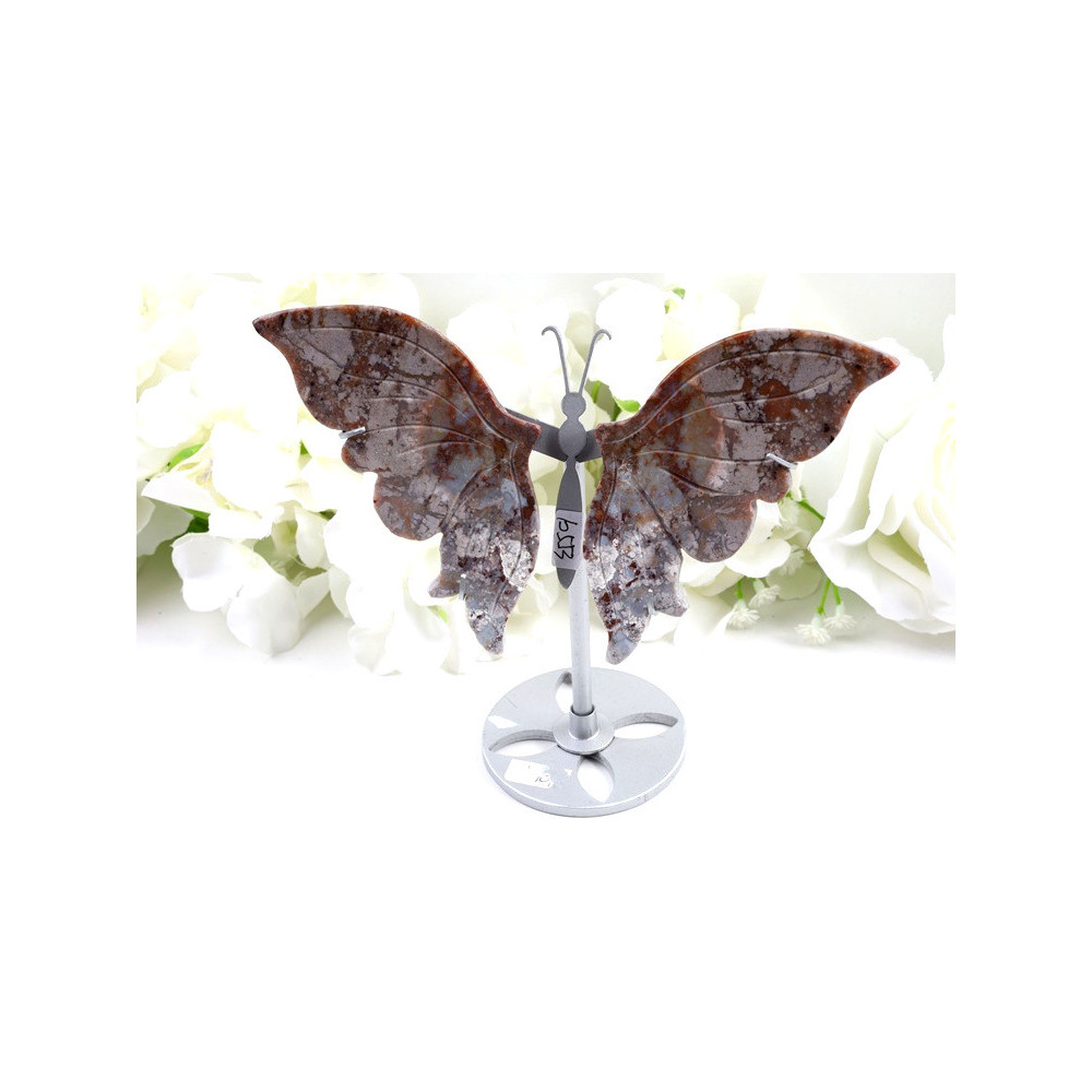 Tento nádherný motýl je vybroušen z mechového achátu s bohatou paletou odstínů. Na fotce vidíme tmavé šedohnědé až černohnědé tóny s jemnými fialovými a nazelenalými akcenty, které vytvářejí přirozené pruhování a mechovou strukturu typickou pro tento druh achátu. Povrch je vysoce leštěný, díky čemuž kámen krásně odráží světlo a vynikne jeho jedinečná kresba. Motýl působí elegantně a má přirozeně symetrický tvar s jemně propracovanými křídly.