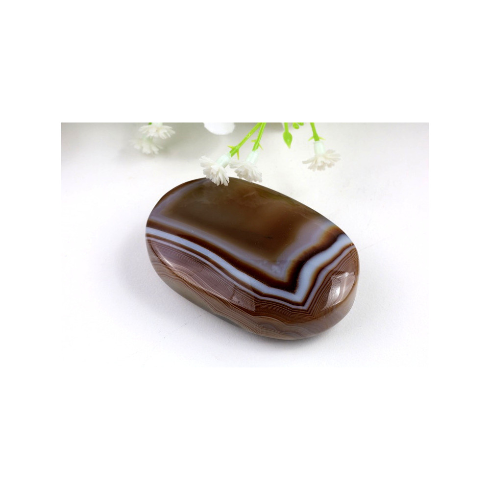 Tento konkrétní kus hnědého achátu vyniká tmavě hnědou až čokoládově hnědou základní barvou, kterou protkávají kontrastní krémově bílé až béžové pásky procházející celým kamenem. Povrch je vysoce leštěný s hedvábným leskem, který zdůrazňuje nádherné páskování a vytváří zrcadlový efekt. Oválný tvar typický pro hmatky činí z tohoto kusu ideální kámen pro meditaci i každodenní nošení.