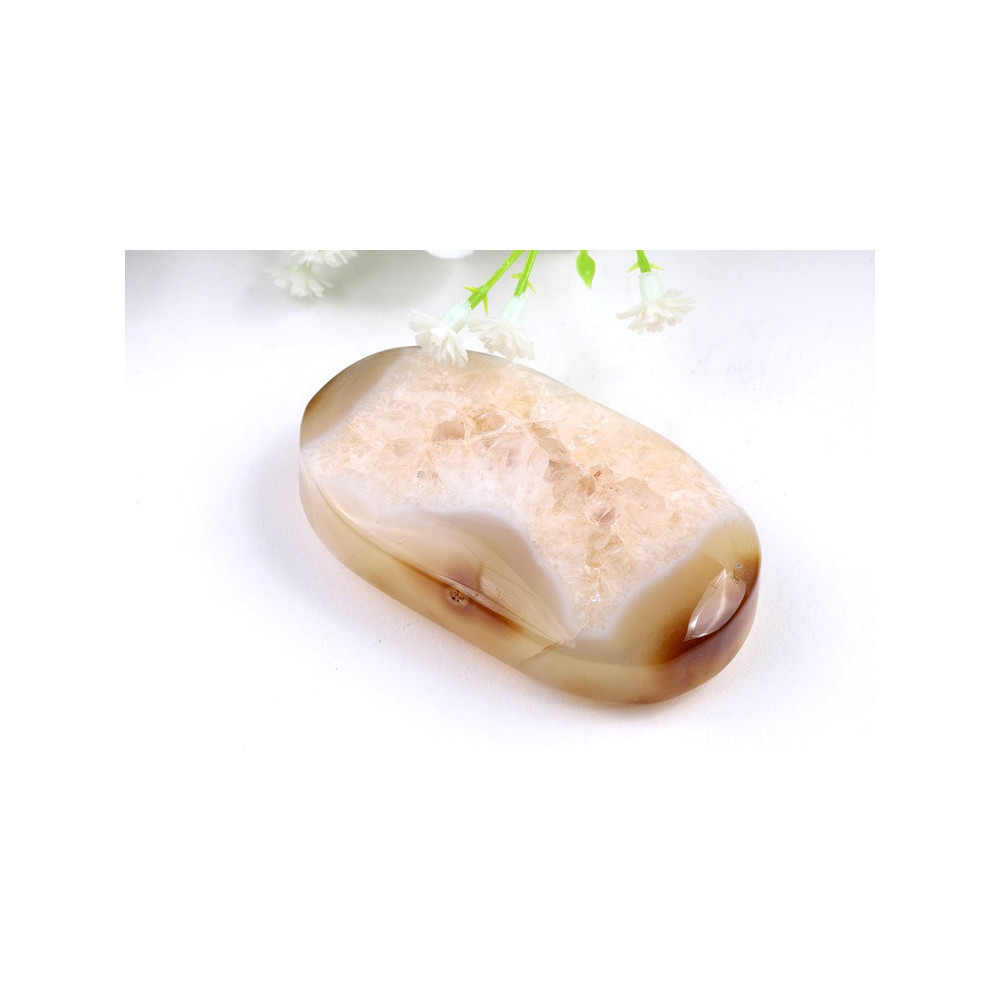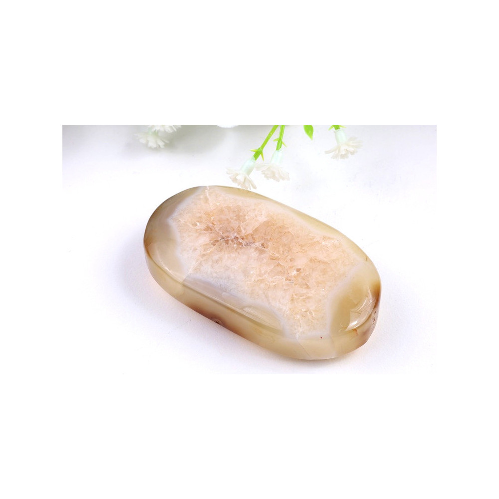 Tento konkrétní penízkový achát uchvacuje svým jemným a elegantním vzhledem. Kámen se prezentuje ve světle béžových až krémových tónech s jemnými hnědými pruhy a subtilním žilkováním, které vytvářejí přírodní vrstevnatou kresbu. Povrch je hladce vyleštěný s hedvábným až skleněným leskem, který podtrhuje homogenní strukturu kamene. Oválný plochý tvar ideálně padne do dlaně a jemné barevné přechody mezi světlými a hnědými tóny dodávají tomuto kusu jedinečný harmonický charakter.