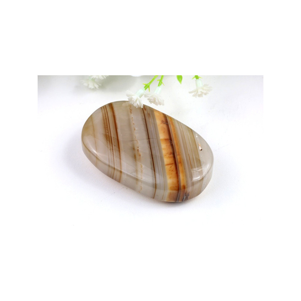 Tento konkrétní kus hmatky z hnědého achátu okouzluje svým výrazným horizontálním pruhováním. Povrch je tvořen jemnými pruhy v odstínech hnědé, béžové a krémové barvy, které vytváří charakteristickou krajinu připomínající vrstvení hornin. Kámen má dokonale vyleštěný povrch s vysokým leskem, který podtrhuje přirozené odlesky minerálu. Oválný tvar hmatky padne příjemně do dlaně a její kompaktní rozměry ji činí ideálním společníkem na cesty i domů.