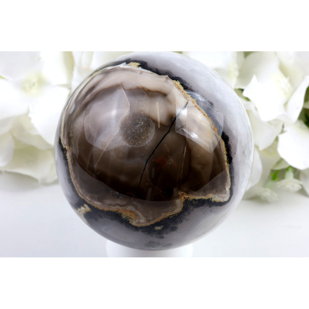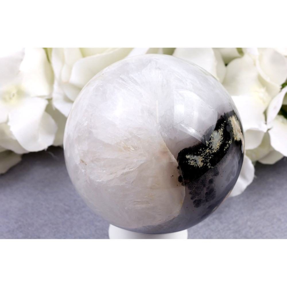Druhá polovina koule plynule přechází do mléčně bílých až lehce průsvitných tónů, s vnitřním rýhováním, jež připomíná jemné peří. Celkově tento originální kus působí robustně a zároveň elegantně, jeho dokonale zaoblený tvar a lesklý povrch lákají k doteku. Hra světla na jeho povrchu zvýrazňuje organické vzory a propůjčuje mu tajemný, živý charakter, který podtrhuje jeho přírodní krásu.