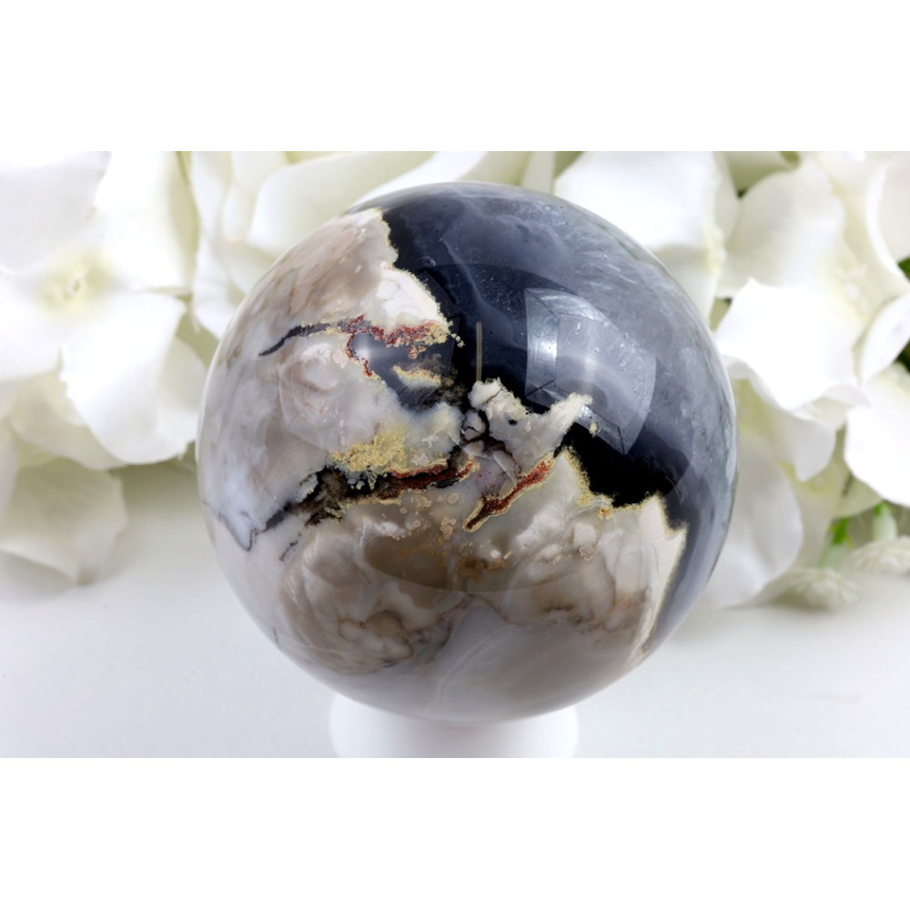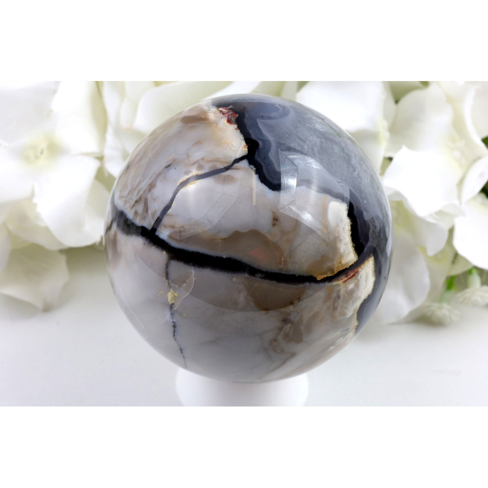Tato fascinující leštěná koule z fluorescenčního achátu č. 1445 okamžitě upoutá pozornost svou bohatou, vrstvenou kresbou. Její povrch odhaluje promyšlené pásy a inkluze v paletě od něžné krémové a mléčně bílé přes různé odstíny šedé, až po sytě černé, téměř uhlové tóny. Zvláště nápadný je výrazný tmavý pás, který elegantně protíná světlé části a vytváří dramatický kontrast, připomínající starobylou mapu neznámých světů. Místy se objevují jemné hnědé až oranžové inkluze, které dodávají celku zemitou hloubku a teplý akcent.