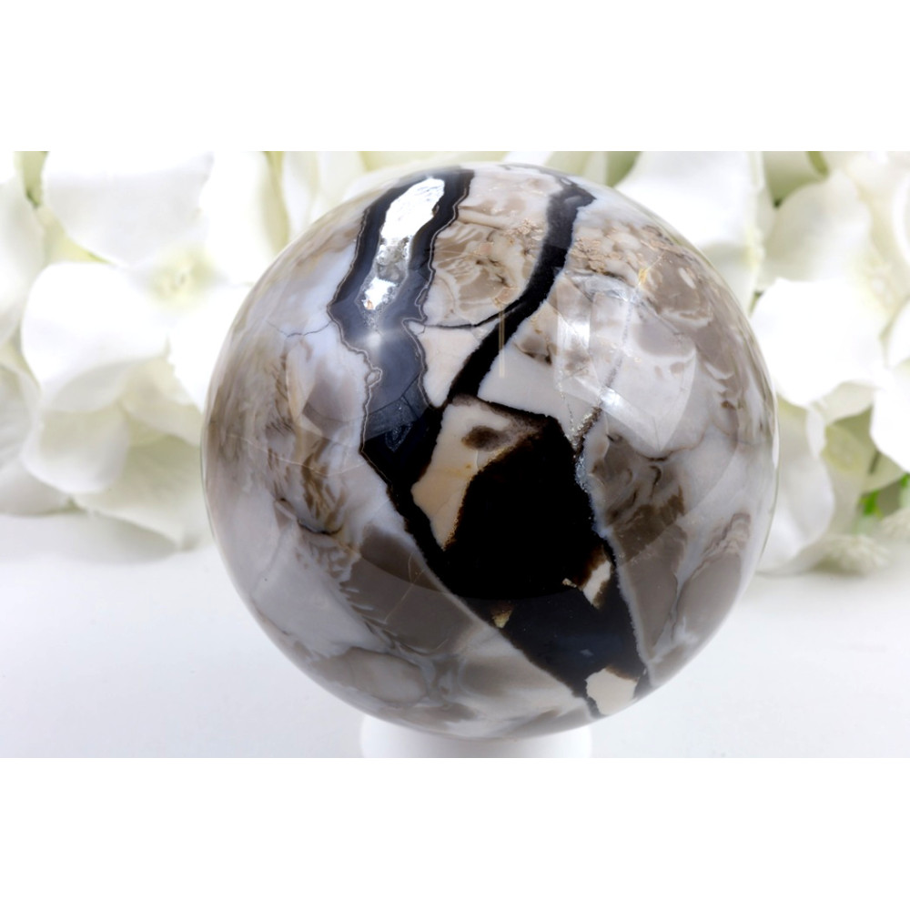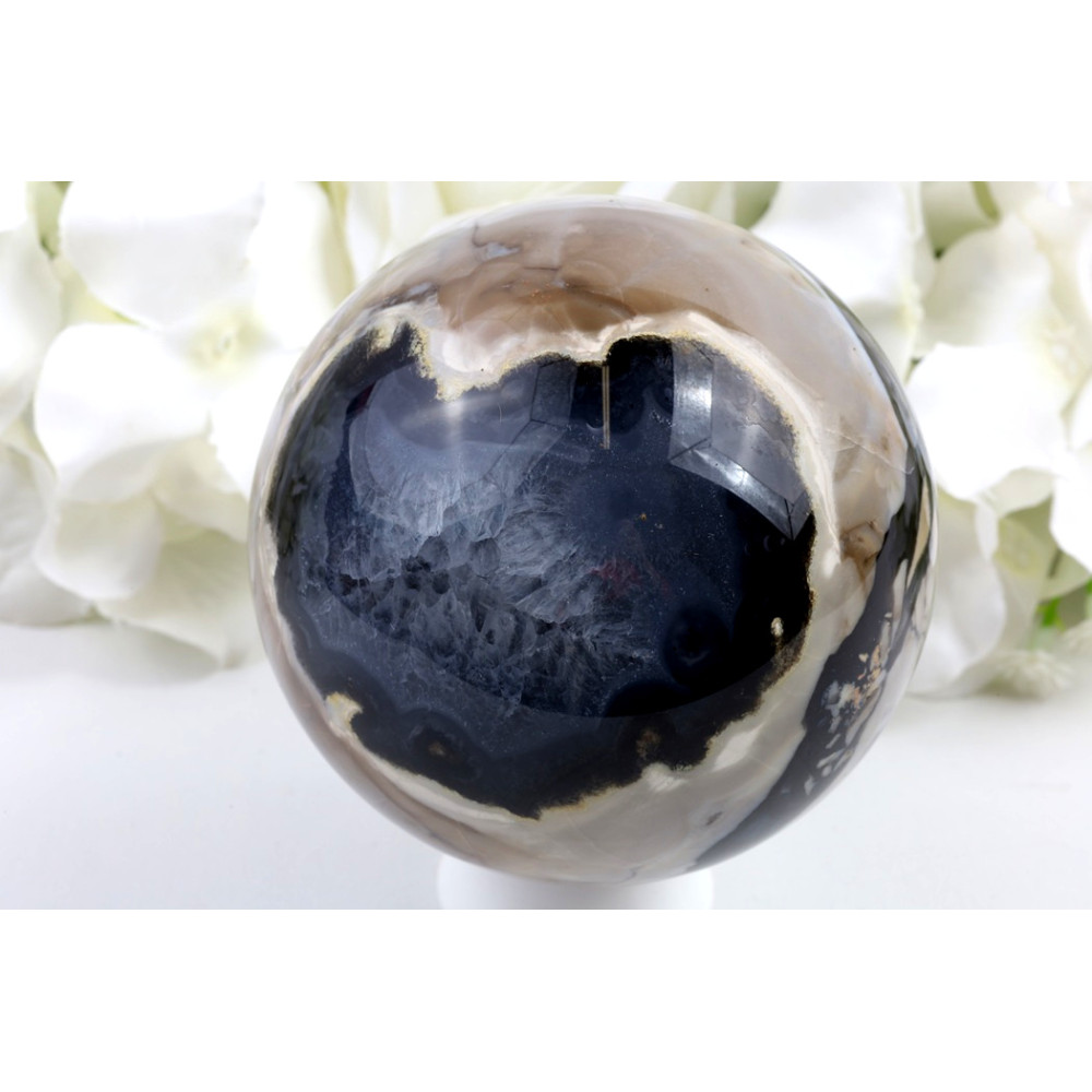 Tato nádherná koule z fluorescenčního achátu č. 1448 poutá pozornost svou podmanivou barevnou paletou, kde se snoubí hluboké tóny černé a tmavě hnědé s mléčně bílými a světle béžovými pruhy, vytvářejícími dynamické obrazce po celém povrchu. V jedné části koule je patrná fascinující dutinka, která odhaluje krystalickou strukturu minerálu, dodávající celku unikátní hloubku a třpyt. Leštěný povrch s vysokým leskem zrcadlí okolní světlo a umocňuje vizuální zážitek.