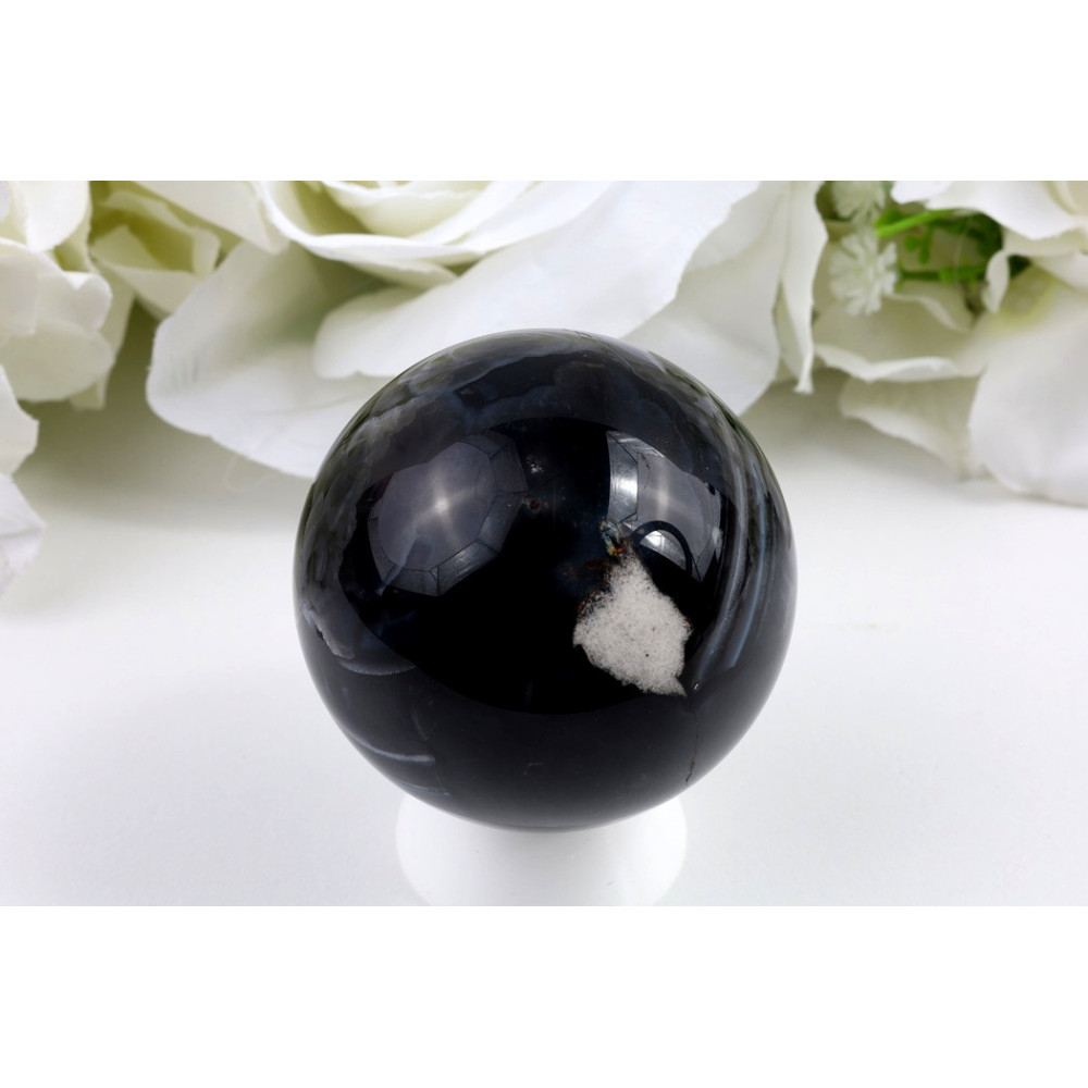 Tato koule o průměru 54 mm kombinuje hlubokou černou barvu s fascinujícími bílými křišťálovými inkluze. Na leštěném povrchu se objevují kontrastní bílé praskliny a průsvitné partie, které vytvářejí neopakovatelnou kresbu připomínající mrazové vzory na skle. Vysoký lesk zvýrazňuje dramatický kontrast mezi temným pozadím a světlými inkluze. V určitých úhlech světla je patrná jemná průsvitnost v bílých partiích, což dodává kusu na hloubce a mystičnosti.
