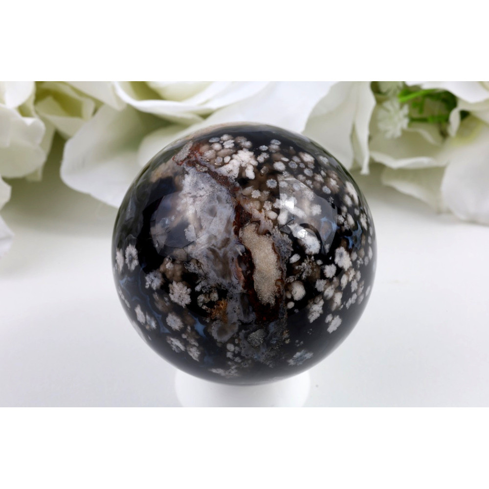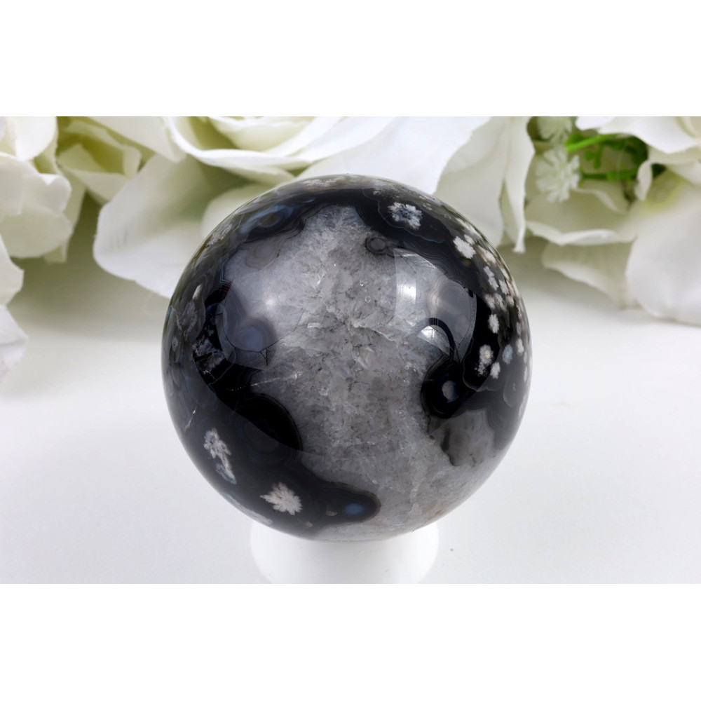 Tato jedinečná koule z černého třešňového achátu uchvátí svým dokonale leštěným povrchem a fascinující kresbou. Dominuje jí hluboká černá barva s našedlými třešňovými tóny, které vytvářejí působivý kontrast s jemnými bílými žilkami procházejícími celým povrchem. Kámen má sklovitý lesk a naprosto hladký povrch, který odráží světlo a zvýrazňuje přirozené vzory. Jedná se o opravdu kvalitně zpracovaný kus s výraznou estetikou a harmonickou kresbou, kde se tmavé a světlejší partie krásně doplňují.