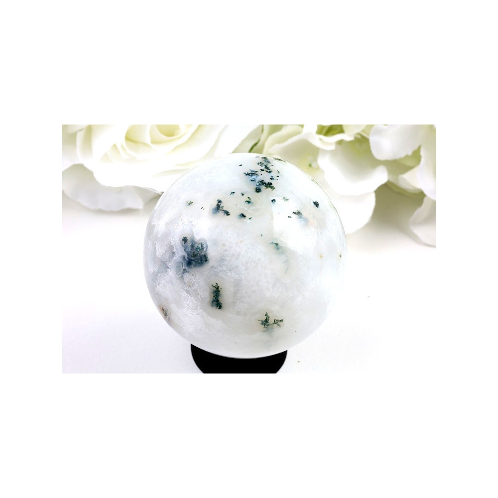Leštěná koule z mechového achátu o průměru 65 mm a hmotnosti 375 g pochází z Brazílie. Povrch kamene je sklovitě lesklý a hladký, s nádherným přírodním vzorem: základní barva je mléčně bílá až jemně šedá, skrze kterou pronikají unikátní zelené mechové inkluze připomínající kapradiny, větvičky či přírodní krajiny v miniatuře. Každý kus má neopakovatelnou kresbu a barevně se liší – právě proto je každý kus naprostý originál a přírodní klenot.
