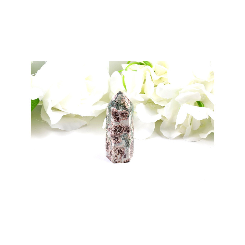 Tento elegantní obelisk okouzlí na první pohled svým harmonickým tvarem a nádhernou barevnou paletou. Základní tón kamene je jemně krémově-béžový, který vytváří dokonalé plátno pro působivé květinové vzory v zelených, šedých a růžových odstínech. Tyto přírodní kreace připomínají jemné květy rozkvetlé zahrady zachycené v kameni. Povrch je pečlivě vybroušen do vysokého lesku, což zvýrazňuje hloubku barev a umožňuje světlu procházet jemnými krystalickými strukturami uvnitř kamene. Špičatý vrchol dodává obelisku majestátní vzhled a směřuje energii vzhůru. Kompaktní rozměry a elegantní tvar z něj činí dokonalý doplněk do každého prostoru.