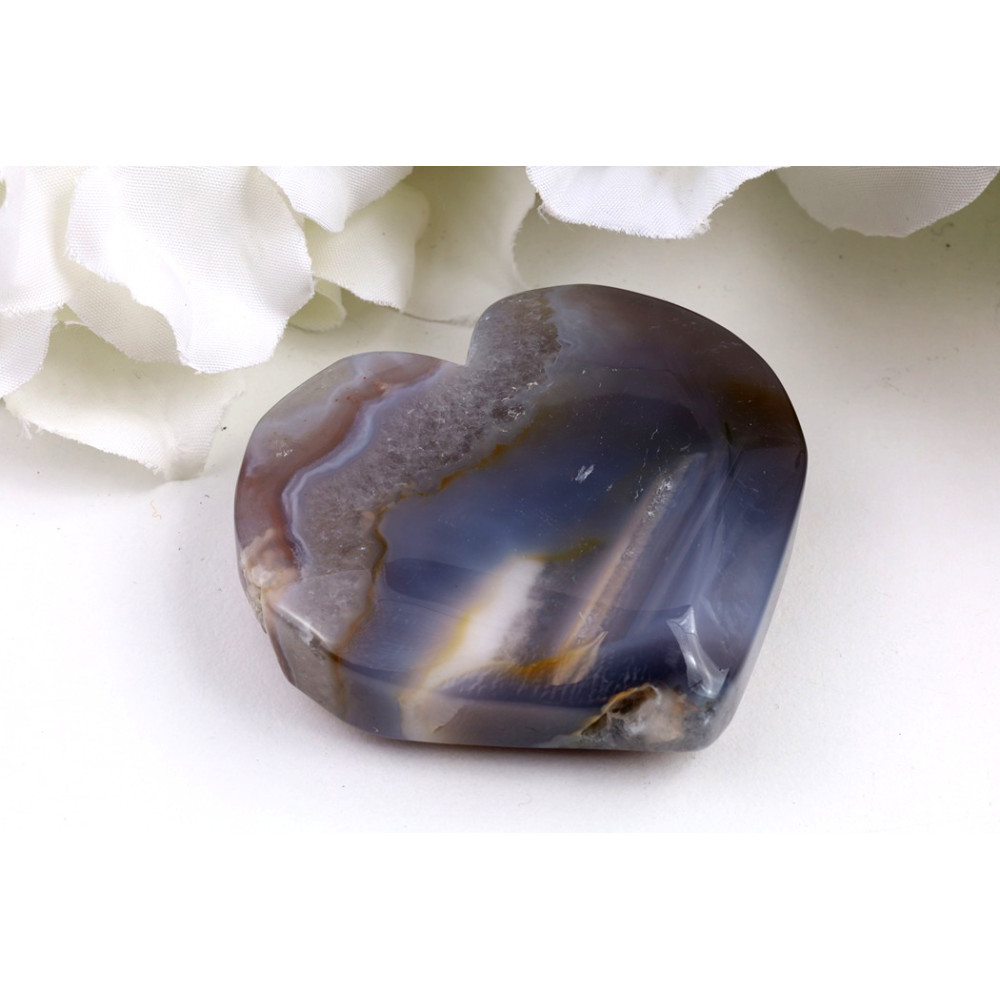 Tento nádherný kus z Třešňového achátu je mistrně vybroušen do tvaru srdce, které láká k pohlazení. Povrch kamene je hladce leštěný, odhalující fascinující hru barev a vrstev. Dominují odstíny zemité šedé a teplé hnědé, které se proplétají s jemnými béžovými a krémovými pásy, tvořícími jedinečnou kresbu. V některých místech prosvítají průsvitné vrstvy a na jedné straně srdce se objevuje i malá, třpytivá dutinka, která dodává kameni punc tajemství a přírodní autenticity.