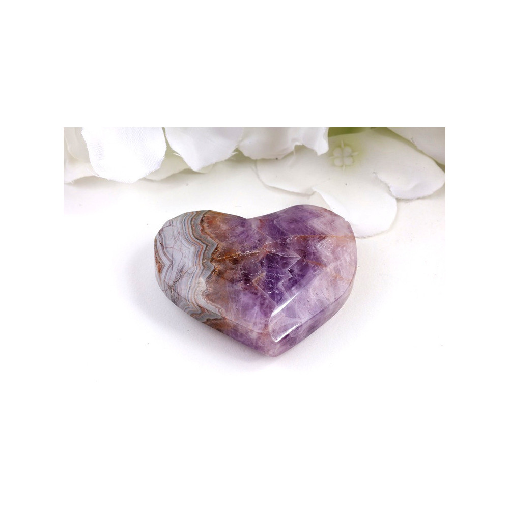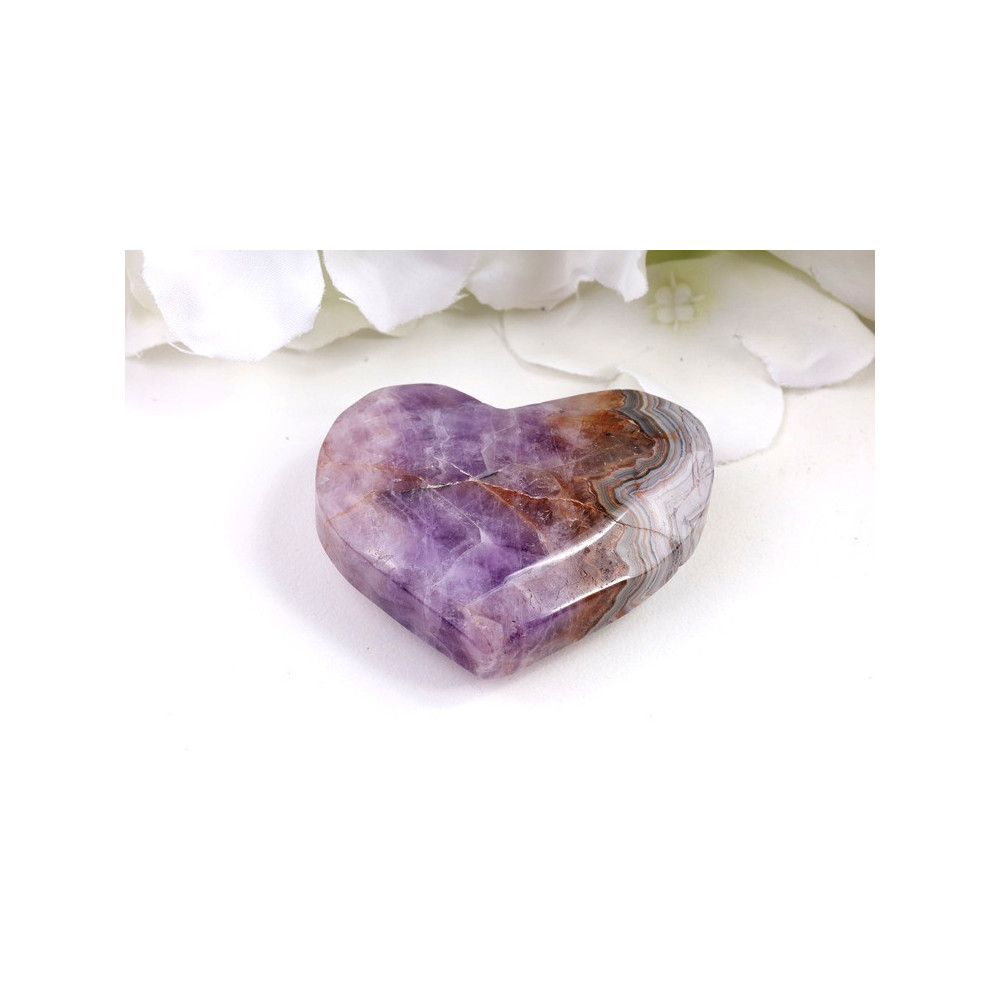 Tento mimořádný kus představuje dokonalé spojení dvou krásných minerálů v romantickém tvaru srdce. Horní část srdce zdobí intenzivně fialové ametystové krystaly, které díky svému přirozenému třpytu a jemným odleskům vytvářejí fascinující hru světla. Středem kamene prochází výrazný béžovo-hnědý achátový pás s charakteristickým proužkováním, který vytváří působivý přírodní kontrast. Spodní část srdce přechází do světlejších fialových až béžových tónů, což celému kusu dodává harmonickou gradaci barev. Povrch je pečlivě vyleštěn do vysokého lesku, který zvýrazňuje hloubku barev a umožňuje plně vnímat krásu obou minerálů. Rozměry 54x47x16 mm činí z tohoto srdce ideální dárek nebo dekorační prvek.