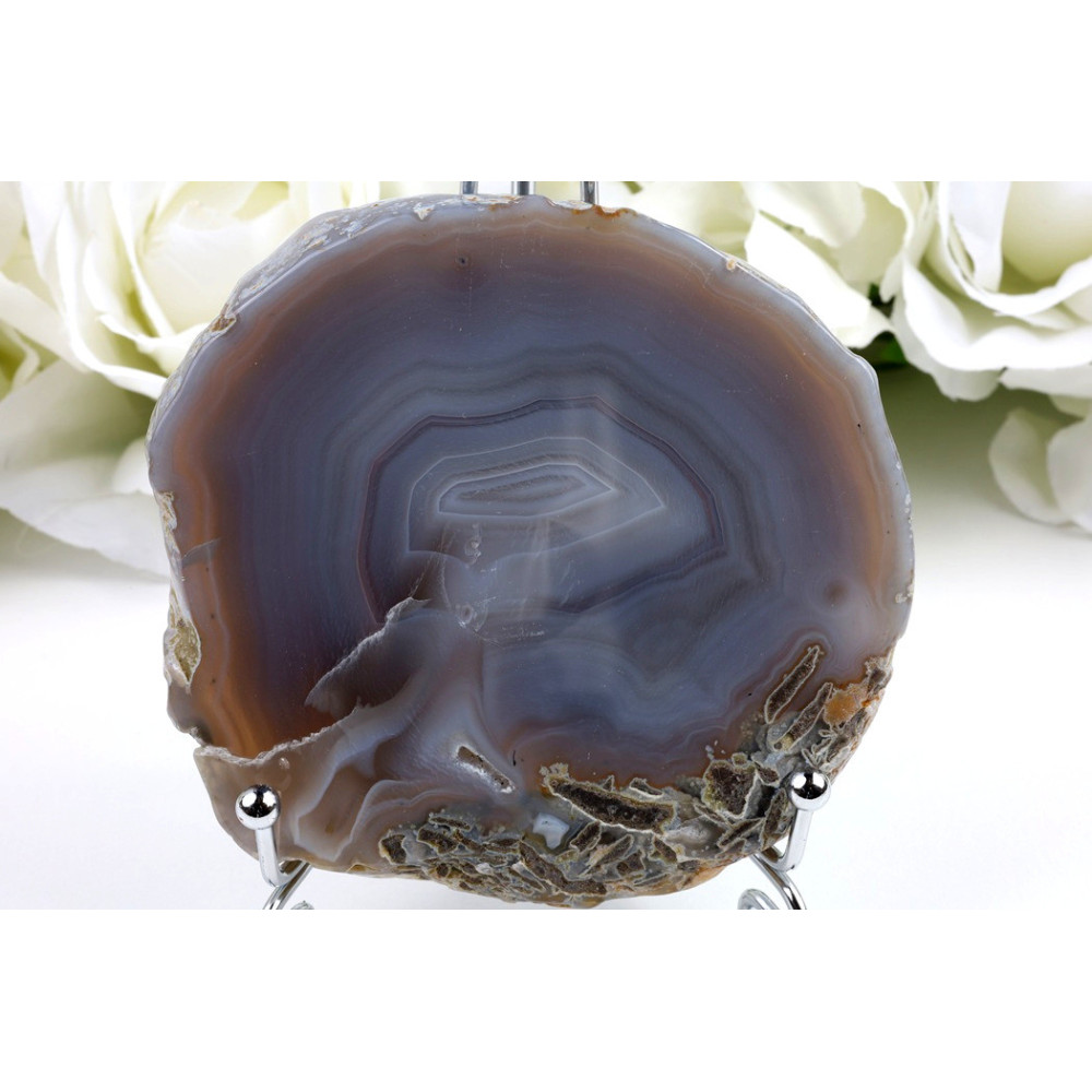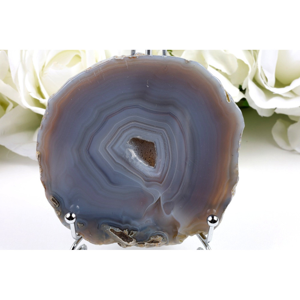 Tento achátový plátek zaujme svou výjimečnou koncentrickou kresbou, která připomíná přírodní umělecké dílo. Na hladkém leštěném povrchu se střídají pásy v modrofialové, šedé, béžové a světle hnědé barvě, které vytvářejí hypnotizující kruhový vzor. Okraje plátku jsou průsvitné a odhalují jemnou strukturu minerálu. Celý povrch má příjemný lesk, který zvýrazňuje barevnou hru jednotlivých vrstev. Tento kus pochází přímo z Brazílie, která je proslulá svými kvalitními acháty.