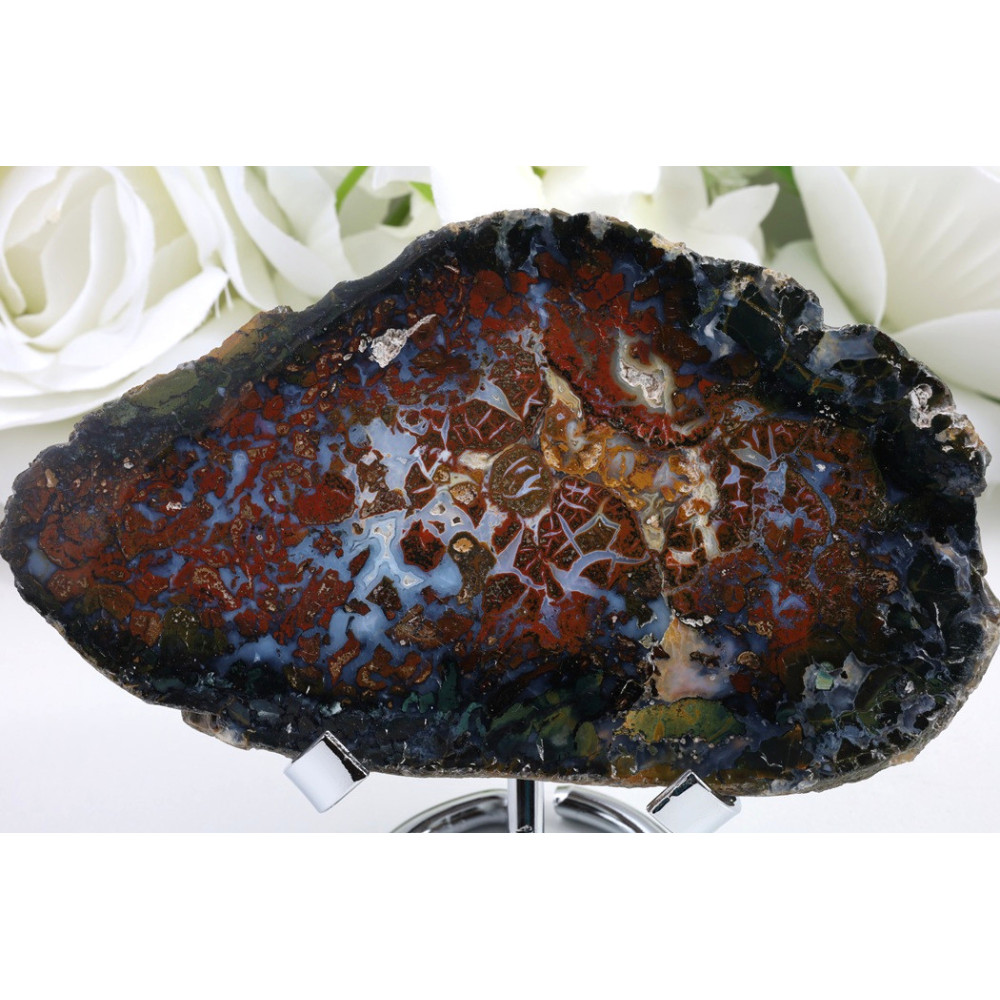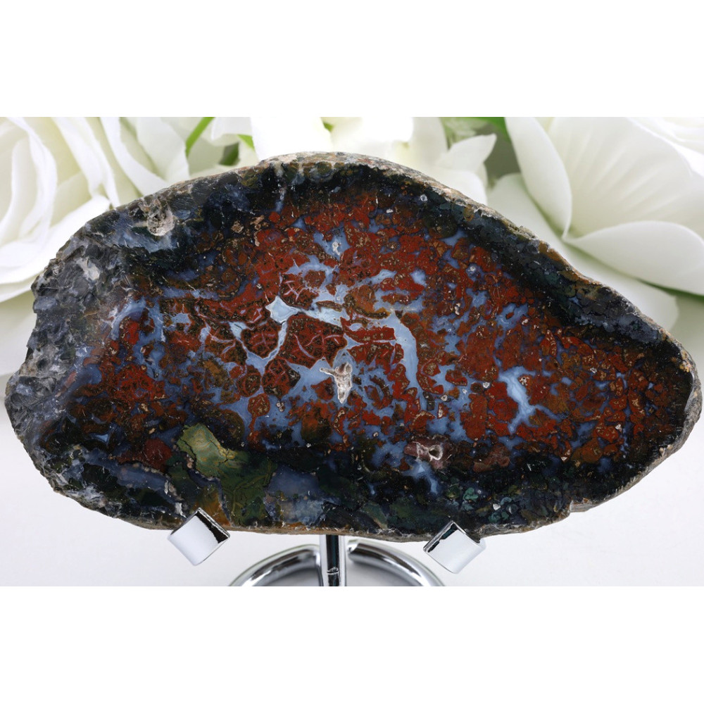 Tento nádherný kus Purbalingga achátu zaujme svými tmavě červenohnědými až červenými tóny, které dokonale kontrastují s výraznými bílými a krémovými vzory. Přírodní kresba vytváří na povrchu organické formace a jemné pruhy, díky nimž je každý plátěk jedinečný. Matný povrch zdůrazňuje přirozenou texturu minerálu a jeho autentický charakter. Rozměry 128 x 75 x 10 mm činí z tohoto kusu ideální dekorativní prvek nebo součást minerální sbírky.