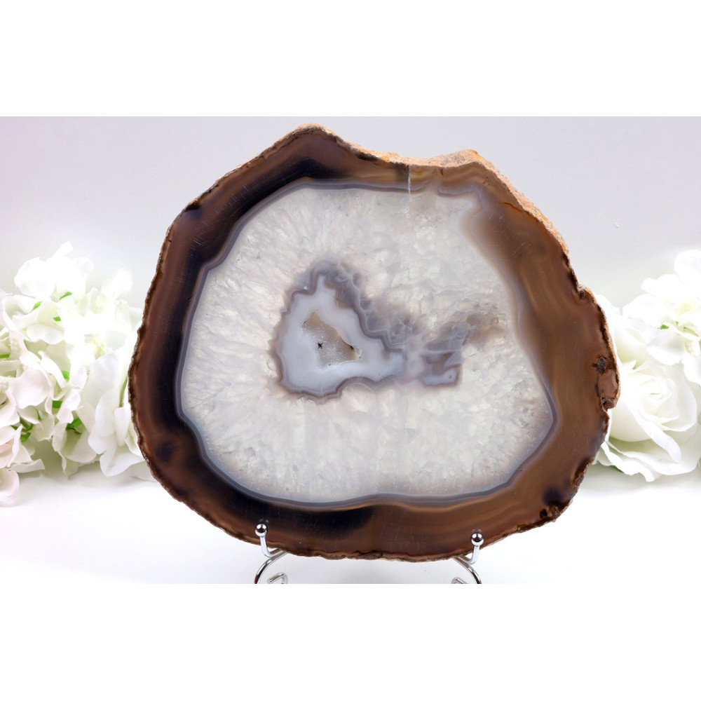 Tento obří achátový plátek o rozměrech 247x220x12 mm je skutečným klenotem z Brazílie. Plátek má oválný tvar s přírodní hnědou kůrou po celém obvodu, která zdůrazňuje jeho přírodní původ. Největším lákadlem tohoto kusu je centrální dutinka zdobená nádhernými fialovými ametystovými krystalky, které jsou zasazeny do hnědého rámečku. Tyto drobné krystalky vytvářejí překrásný kontrast s leštěným povrchem achátového plátku. Povrch má jemnou přírodní kresbu v teplých tónech. Zadní strana plátku je tmavě zelená až černá s matnou texturou, což vytváří zajímavý kontrast s přední stranou. Tento kus s hmotností 1365 g je opravdu impozantní díky svým obřím rozměrům.