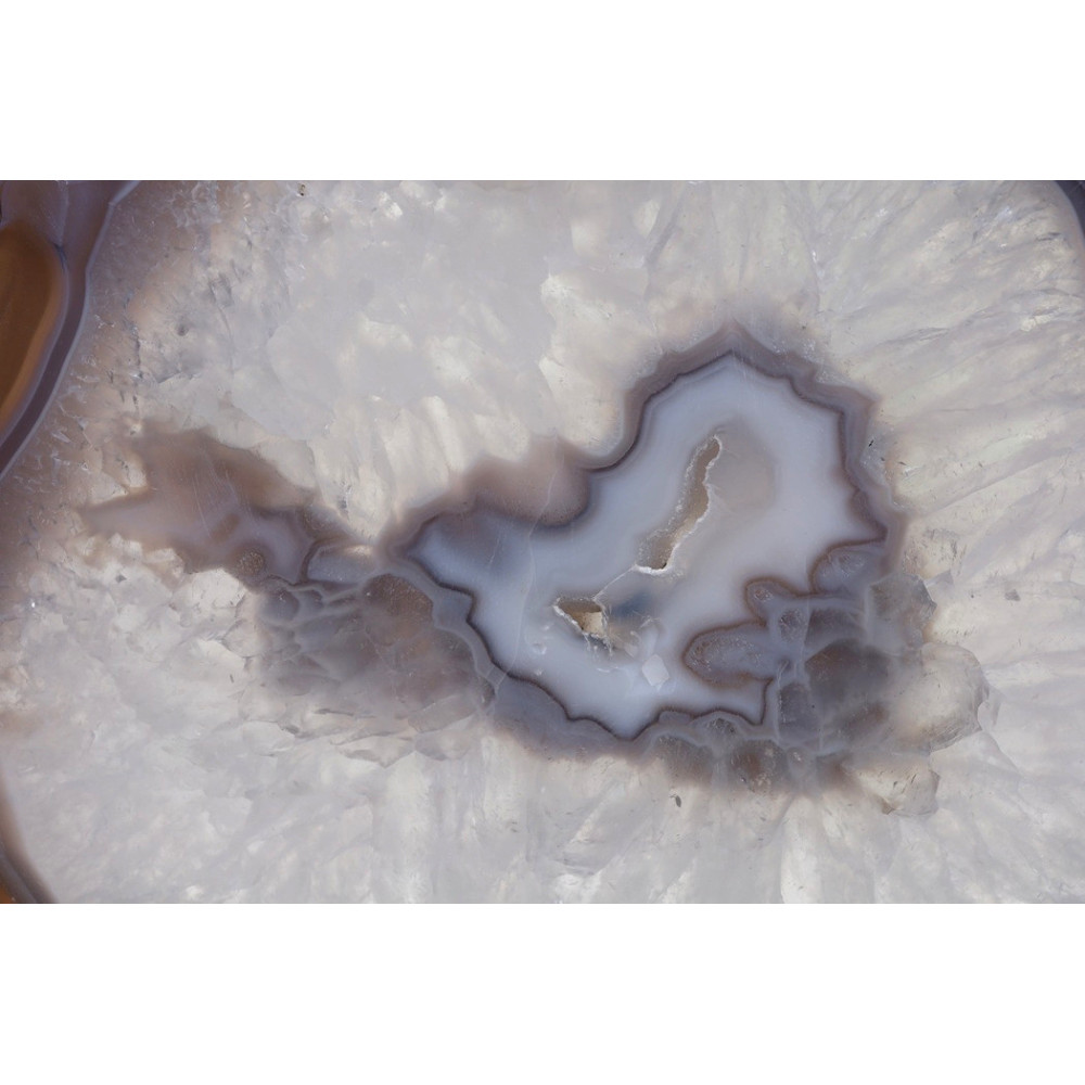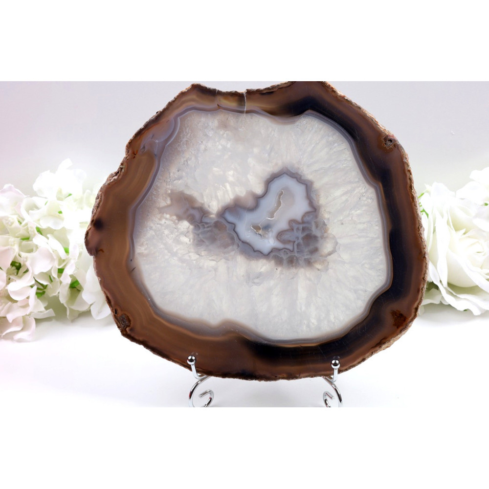 Tento obří achátový plátek je díky svým rozměrům ideální jako dominantní dekorativní prvek ve vašem domě nebo pracovním prostoru. Můžete jej umístit na stůl, poličku či komodu, kde se stane okamžitým středem pozornosti. Díky stojánku (který je k dispozici zvlášť) lze plátek prezentovat vstoje, což zvýrazní jeho impozantní velikost a krásu centrální ametystové dutinky. Je vhodný do obývacího pokoje, pracovny, meditačního prostoru nebo jako součást vaší sbírky minerálů. Tento kus je také skvělým dárkem pro milovníky minerálů a přírodních krás.