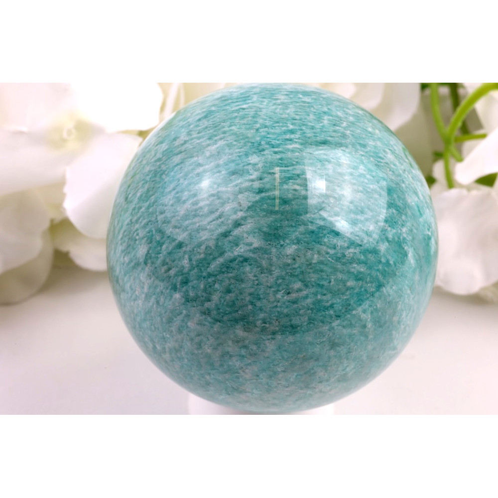 Tato jedinečná koule z amazonitu č. 1272 vás okouzlí svou sytou tyrkysově zelenou barvou, která místy přechází do jemnějších modrozelených odstínů. Po celém jejím povrchu se táhne fascinující kresba tvořená světlými, téměř bílými, krystalickými inkluzemi, které dodávají kameni hloubku a jedinečný charakter. Povrch koule je dokonale hladce leštěný, což zvýrazňuje jeho přirozený lesk a umožňuje krásné odlesky světla. Je to skutečně vizuálně podmanivý originální kus, který působí jako ztělesnění přírodní krásy.