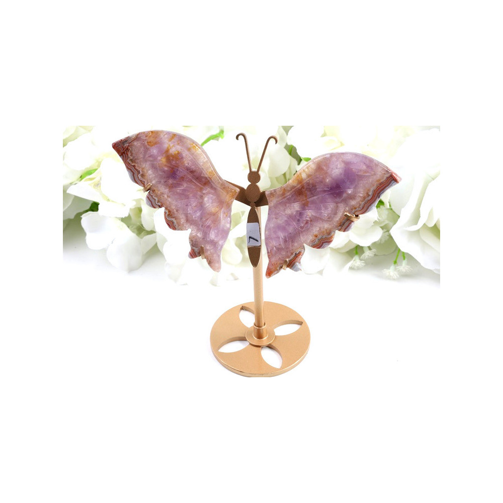 Ametyst achát je fascinující kombinací ametystu a achátu, která spojuje vlastnosti obou minerálů. Tento kámen je tradičně spojován s klidem, vnitřním mírem a harmonií. V lidové tradici se říká, že ametyst achát podporuje duchovní růst, pomáhá při meditaci a přináší pocit vyrovnanosti. Je ceněn pro svou schopnost uklidnit mysl a podpořit emocionální rovnováhu. Tvar motýla symbolizuje proměnu, nový začátek a osobní růst, což z tohoto kusu činí ideálního průvodce na cestě sebepoznání.