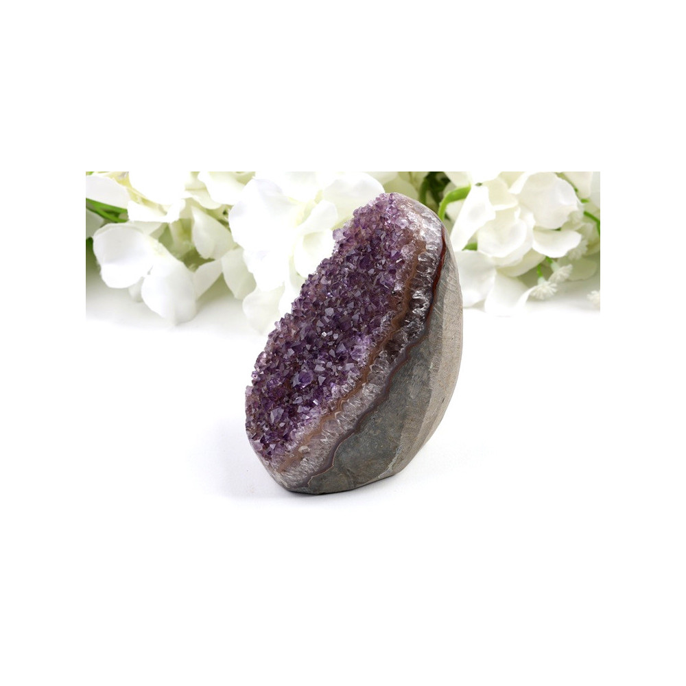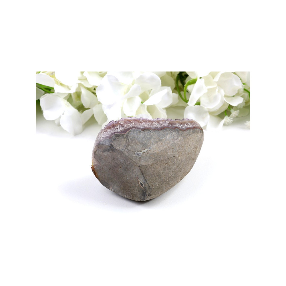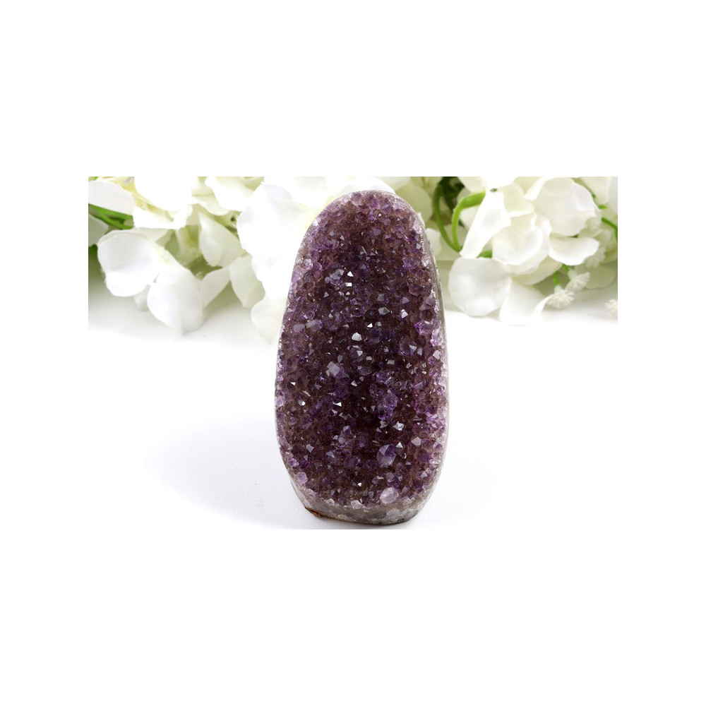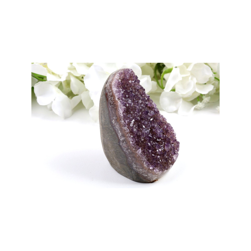Tato ametystová geoda zaujme svým elegantním vejčitým tvarem, který připomíná drahocenný klenotec. Vnitřní dutina je hustě pokryta drobnými ametystovými krystaly v intenzivní fialové až tmavě fialové barvě, které na světle překrásně třpytí. Vnější povrch je přírodní, šedý až béžový, se stopami po hornině. Kompaktní velikost a stabilní tvar činí z této geody ideální kus do dlaně nebo na pracovní stůl.