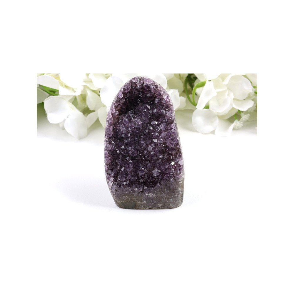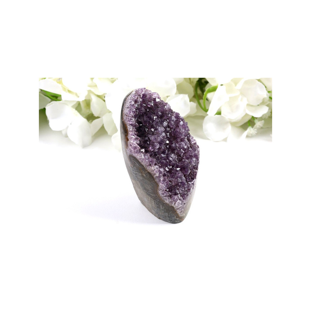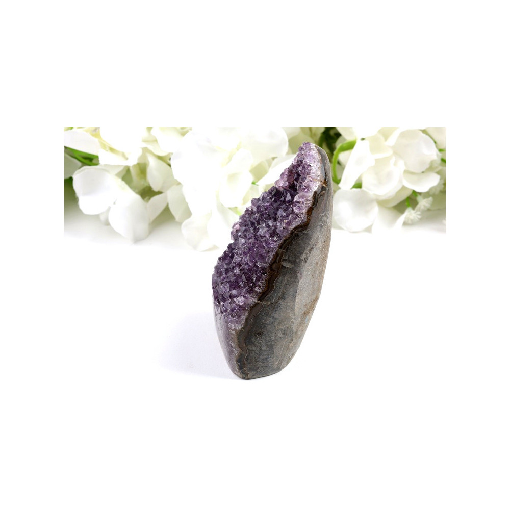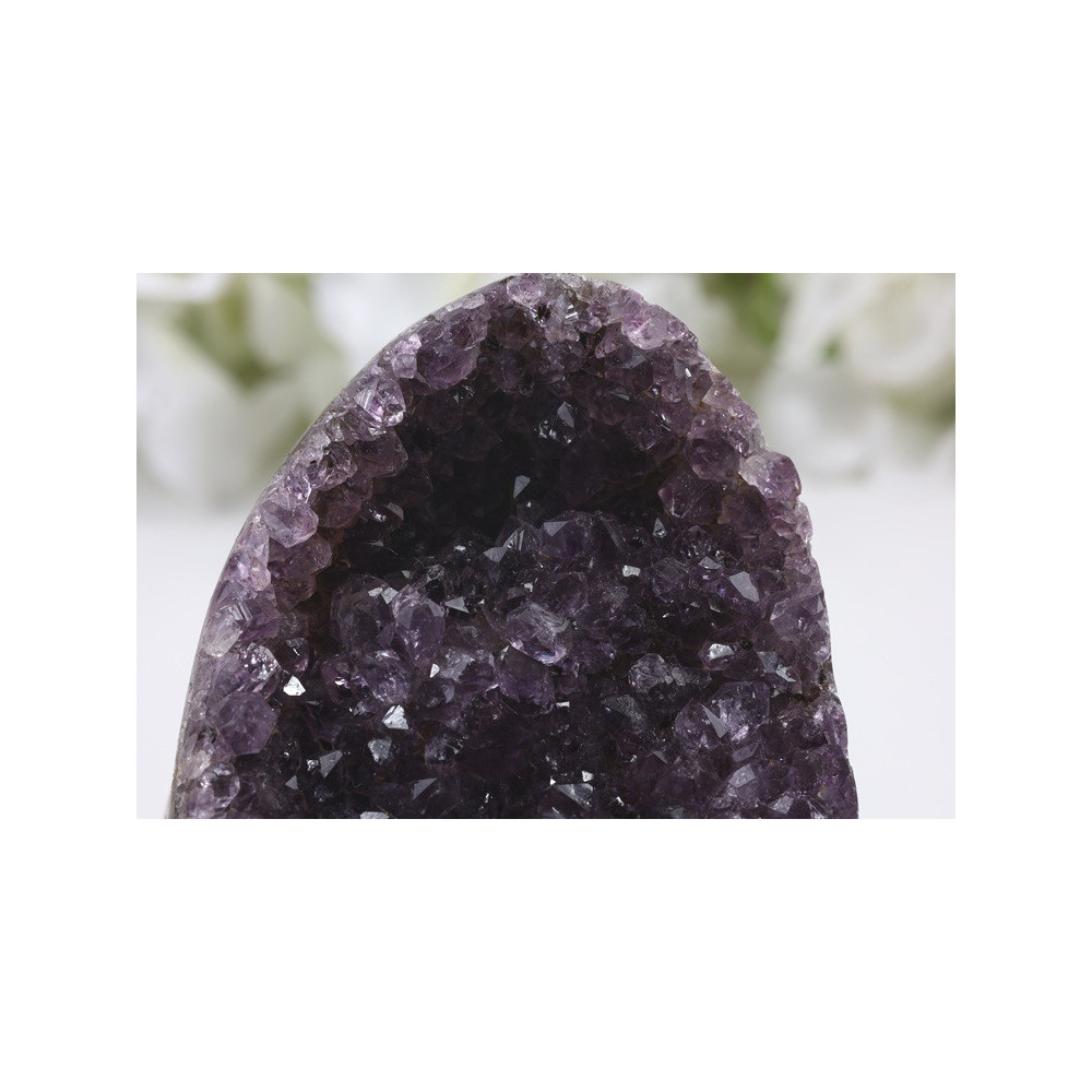 Tato nádherná ametystová geoda okouzlí svou přirozenou krásou. Na první pohled zaujme bohatá paleta fialových odstínů - od jemně světlé levandulové až po sytě tmavě fialovou barvu, která podtrhuje unikátnost každého krystalu. Krystaly vytvářejí překrásnou strukturu uvnitř šedého až béžového vnějšího obalu geody. Povrch krystalů má přirozený lesk, který se nádherně láme ve světle a vytváří fascinující hru barev a odlesků. Jedná se o autentický kus přírody s jedinečnou kresbou a uspořádáním krystalů.