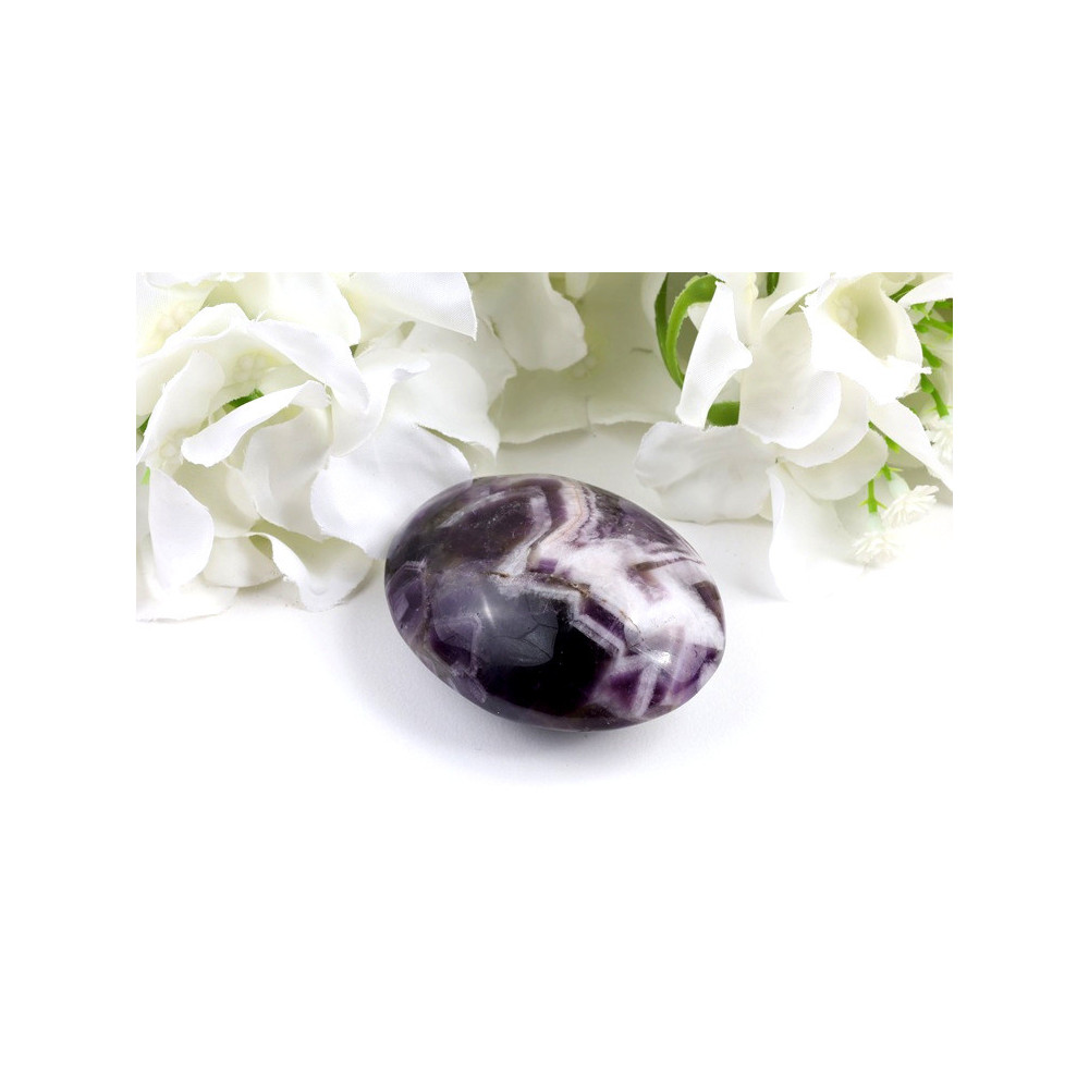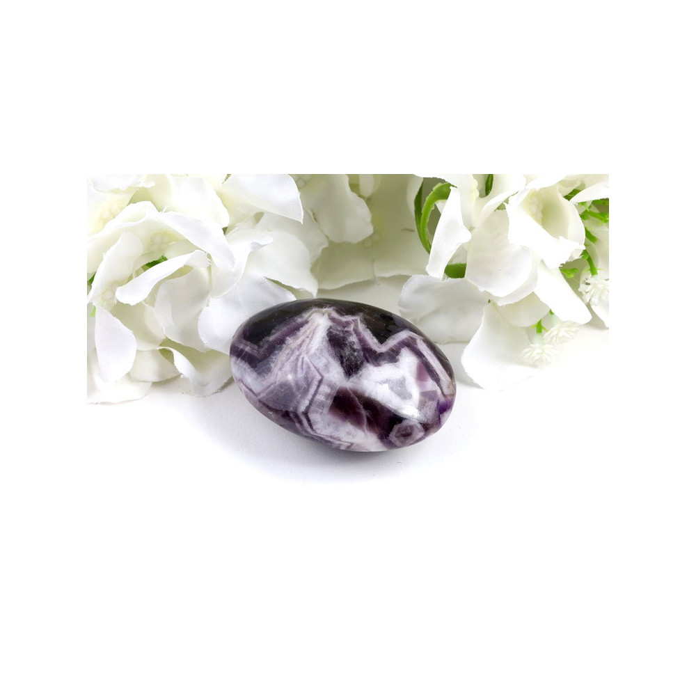Tato nádherná Dream ametyst hmatka okouzlí svým jedinečným chevronovým vzorem, který vytváří fascinující kombinaci sytě fialových a čistě bílých pruhů. Precizně leštěný povrch odráží světlo a zvýrazňuje přirozenou krásu tohoto vzácného minerálu. Hmatka má ergonomický oválný tvar s rozměry 63x48x29 mm, který dokonale padne do dlaně a poskytuje příjemný pocit při manipulaci. Hmotnost 109 gramů dodává kameni příjemnou váhu, která podtrhuje jeho kvalitu a autenticitu. Každý kousek je originální přírodní výtvor s jedinečným uspořádáním chevronových pásů.