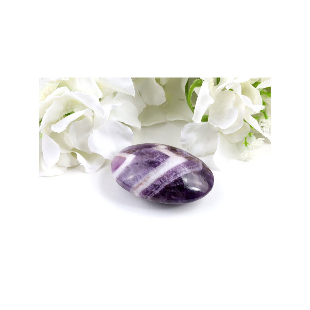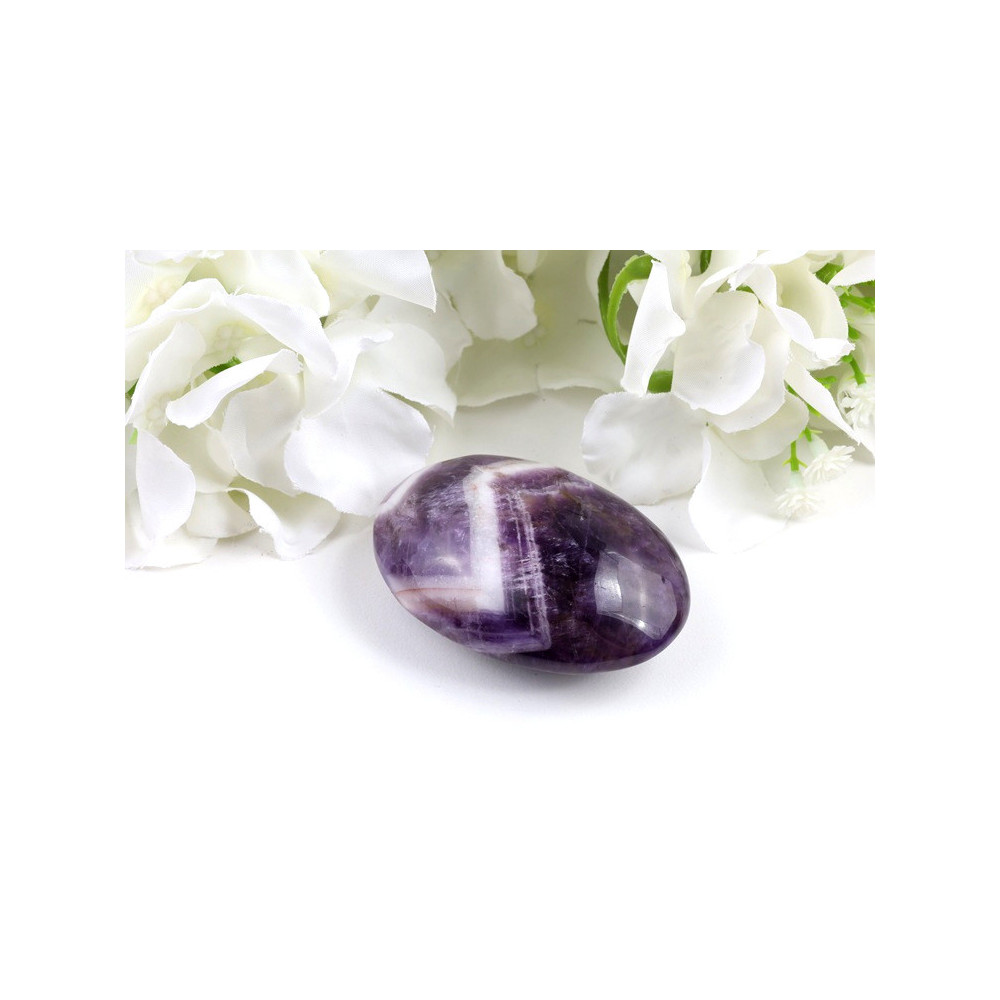 Hmatka je precizně vybroušena do ergonomického oválného tvaru, který dokonale padne do dlaně. Povrch je leštěn do vysokého lesku, což zvýrazňuje hloubku barevných přechodů a dodává kameni luxusní vzhled. Při pohledu na kámen lze pozorovat jemné nuance fialové barvy - od hlubokých tmavých tónů až po delikátní levandulové odstíny, které se prolínají s bílými až průsvitnými pruhy křemene.