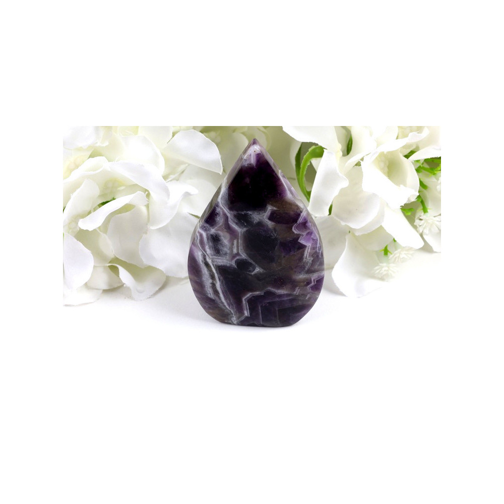 Dream ametyst, známý také jako chevron ametyst, je zvláštní varietou ametystu pocházející z Brazílie. Vyznačuje se vrstvami fialového ametystu prokládanými bílým křemenem, což vytváří typický pruhovaný nebo mramorovaný vzor. Tento minerál je ceněný pro své silné duchovní vlastnosti - podporuje intuici, zklidňuje mysl a pomáhá při meditaci. Dream ametyst je považován za mocný ochranný kámen, který chrání před negativní energií a posiluje spojení s vyššími duchovními rovinami. Podporuje jasné sny a napomáhá k lepšímu pochopení snových poselství. Harmonizuje čakry a přináší vnitřní klid a rovnováhu.