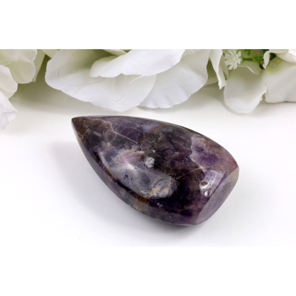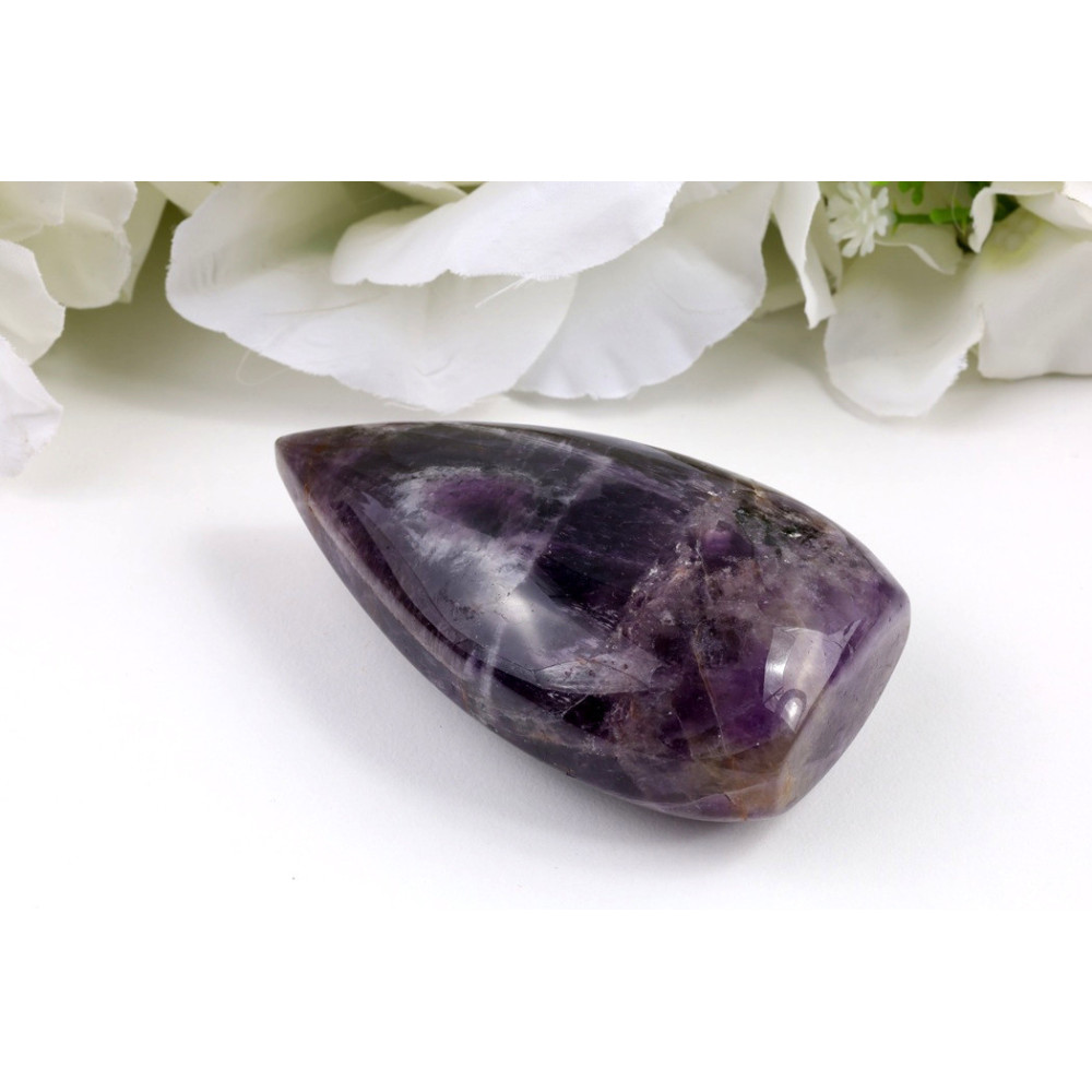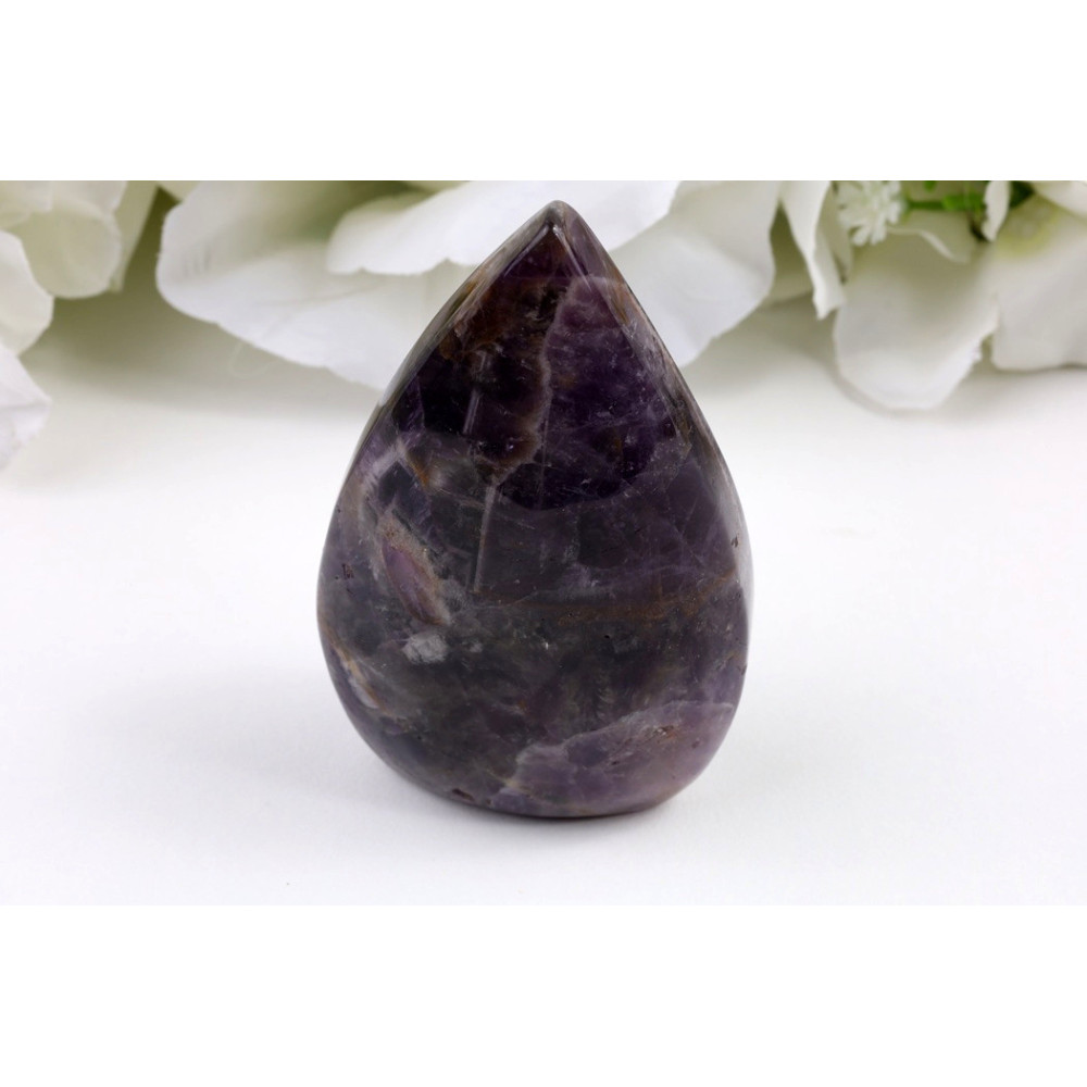 Tento výjimečný exemplář představuje špici z pravého brazilského ametystu s impozantními rozměry. Kámen se vyznačuje intenzivní tmavě fialovou barvou, která vytváří nádherné barevné zóny a vrstvy v celém objemu. Povrch je profesionálně leštěn do vysokého lesku, díky čemuž září krásným diamantovým odleskem. Tvar připomíná elegantní kapku nebo slzu, se zašpičatělým zakončením. Uvnitř kamene jsou patrné zajímavé krystalické struktury a barevné přechody, které dodávají kusu jedinečný charakter a hloubku.