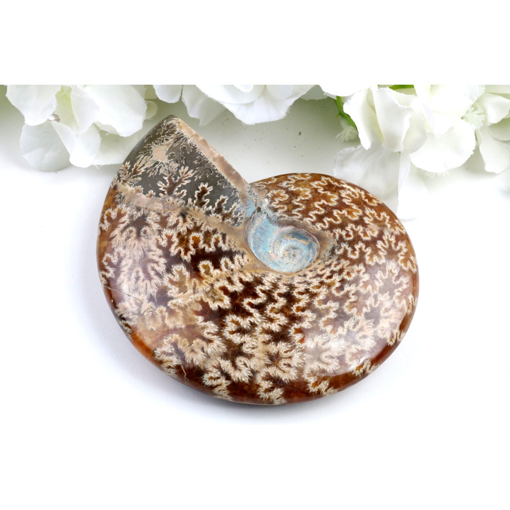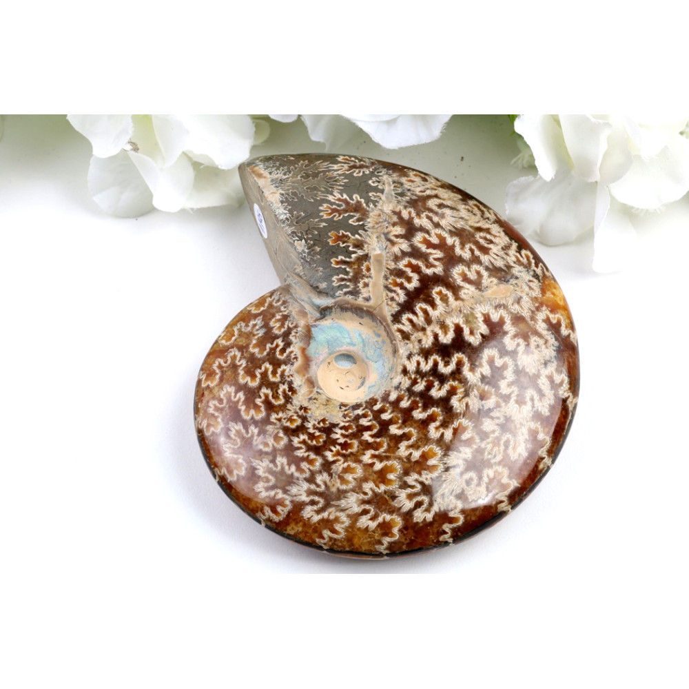 Tento konkrétní exemplář v celku je mistrovským dílem přírody. Jeho harmonický spirálovitý tvar, typický pro vyhynulé hlavonožce, je dokonale zachován a s hladkým, lesklým povrchem nabízí příjemný hmatový zážitek. Centrální závit odhaluje jemné iridiscentní odlesky v odstínech modré a zelené, které dodávají fosilii mystický nádech a připomínají, že i v dávných dobách existovala barvitá krása. Je to vizuálně podmanivý objekt, který vybízí k prozkoumávání jeho prastarých tajemství a přemítání o čase.