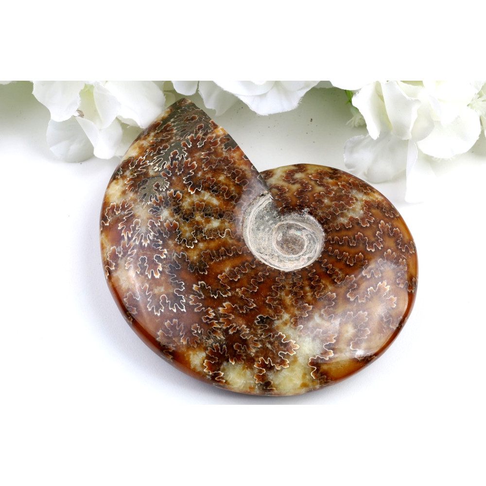 Tento nádherný amonit v celku číslo 1652 zaujme na první pohled svou detailní, složitou kresbou a teplými odstíny hnědé, béžové a krémové. Na jeho leštěném povrchu vynikají charakteristické komůrkové struktury, které připomínají labyrint dávných příběhů. Jemné linie a ornamenty, vzniklé mineralizací schránky, vytváří vizuálně poutavý reliéf, dokonale patrný po celém obvodu fosilie. Zvláště pak vyniká jeho spirálovitý střed, který je jemně krémový a odlišuje se od tmavších okrajů.