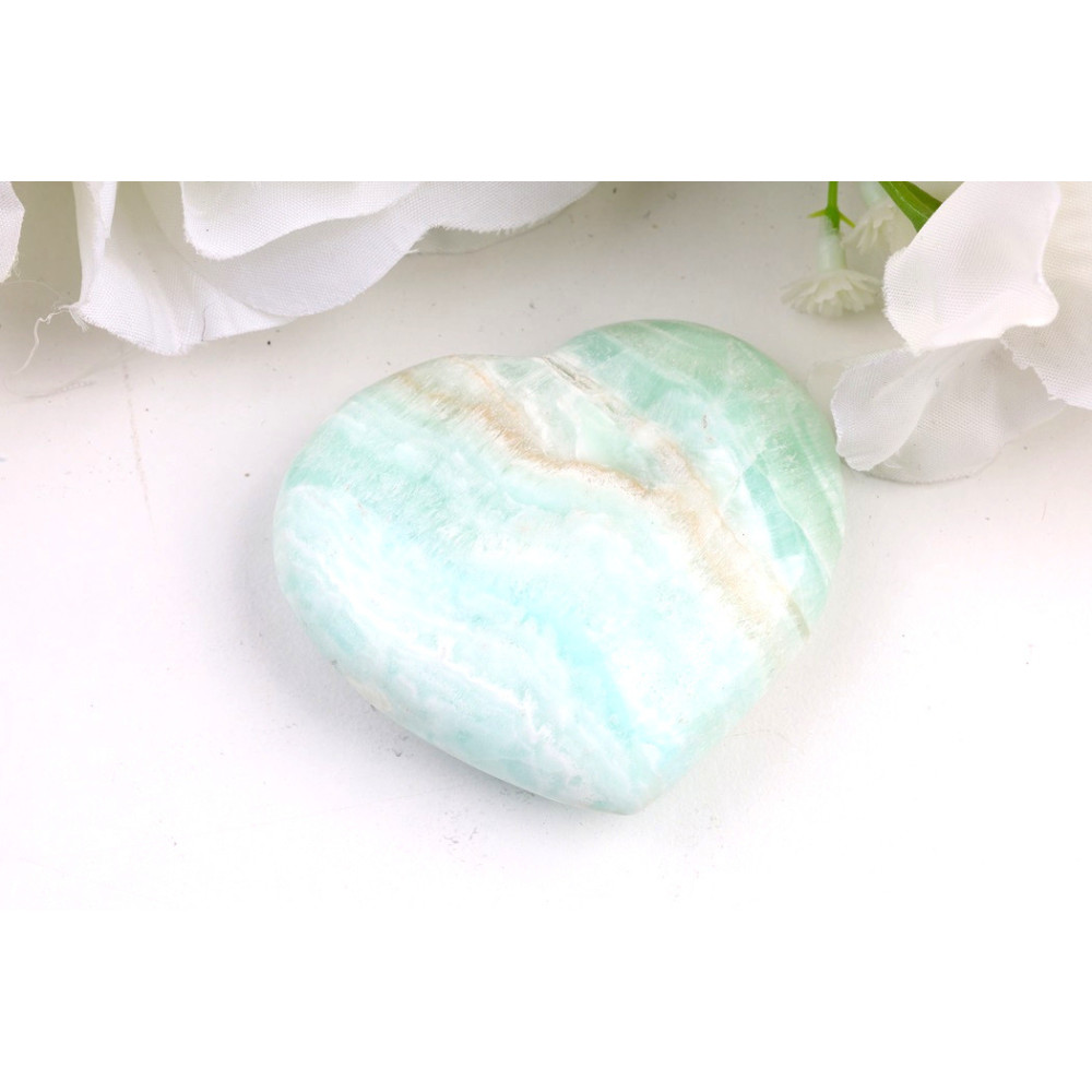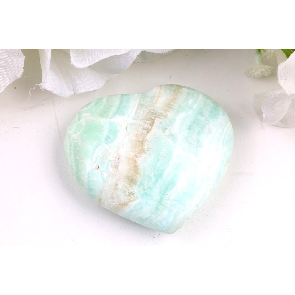 Tento konkrétní kousek modrého aragonitu ve tvaru srdce se pyšní jemnými odstíny modrozelené, které se prolínají s krémově bílými a světle hnědými pruhy. Leštěný povrch zvýrazňuje jeho hedvábný lesk a odhaluje fascinující vrstvenou kresbu. Je dokonale vyhlazené a příjemné na dotek, bez viditelných prasklin či dutinek, což z něj činí skutečně krásný dekorativní kámen, ručně vybraný pro svou jedinečnost.