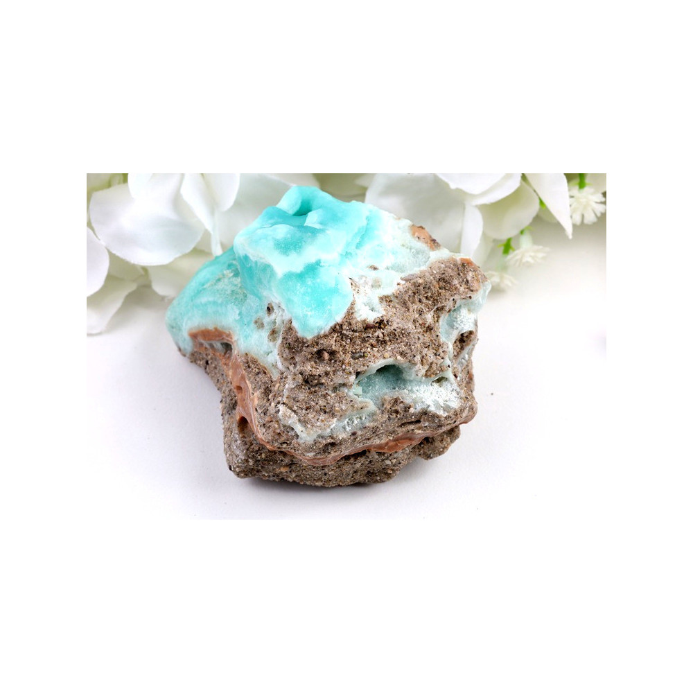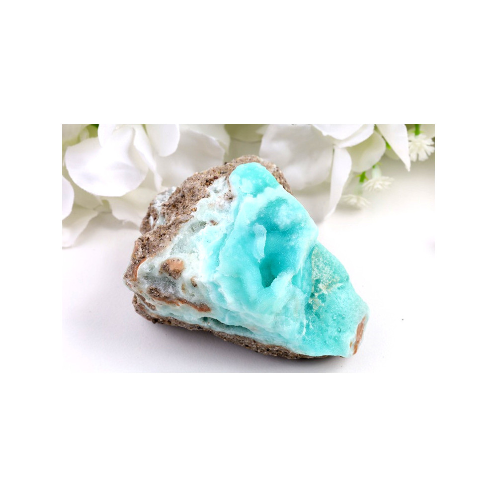 Aragonit má kompaktní formu s viditelnou hnědou kamenitou matricí, která vytváří zajímavý kontrast s tyrkysovou barvou hlavního minerálu. Povrch kamene je částečně hladký s přirozeným leskem, který dodává kusu na eleganci. Rozměry 80x62x50 mm a hmotnost 263 gramů z něj činí ideální exponát do sbírky i praktický kámen pro duchovní práci.