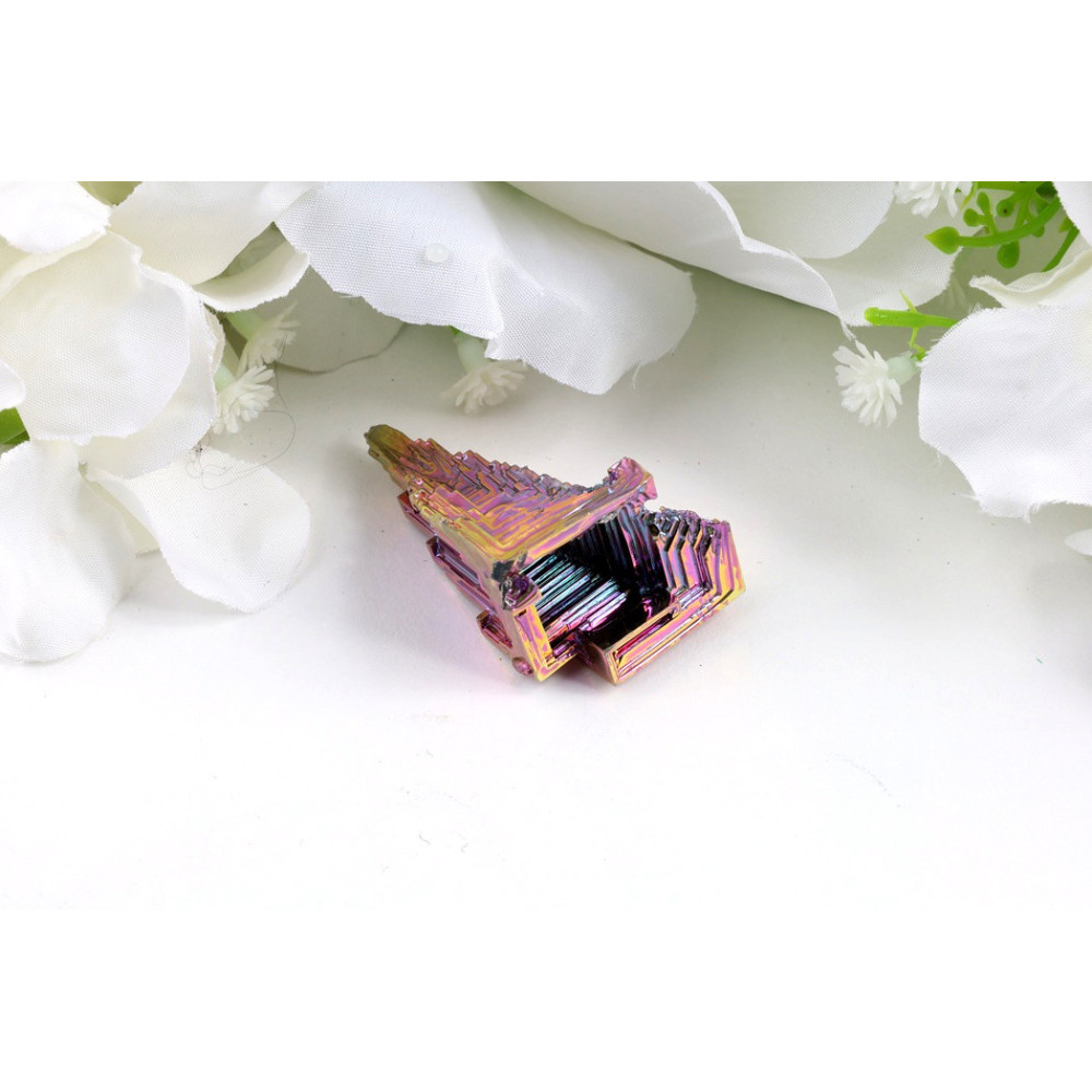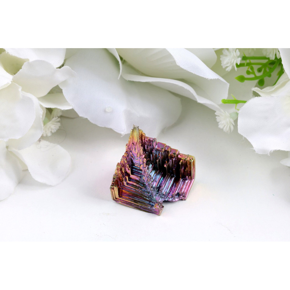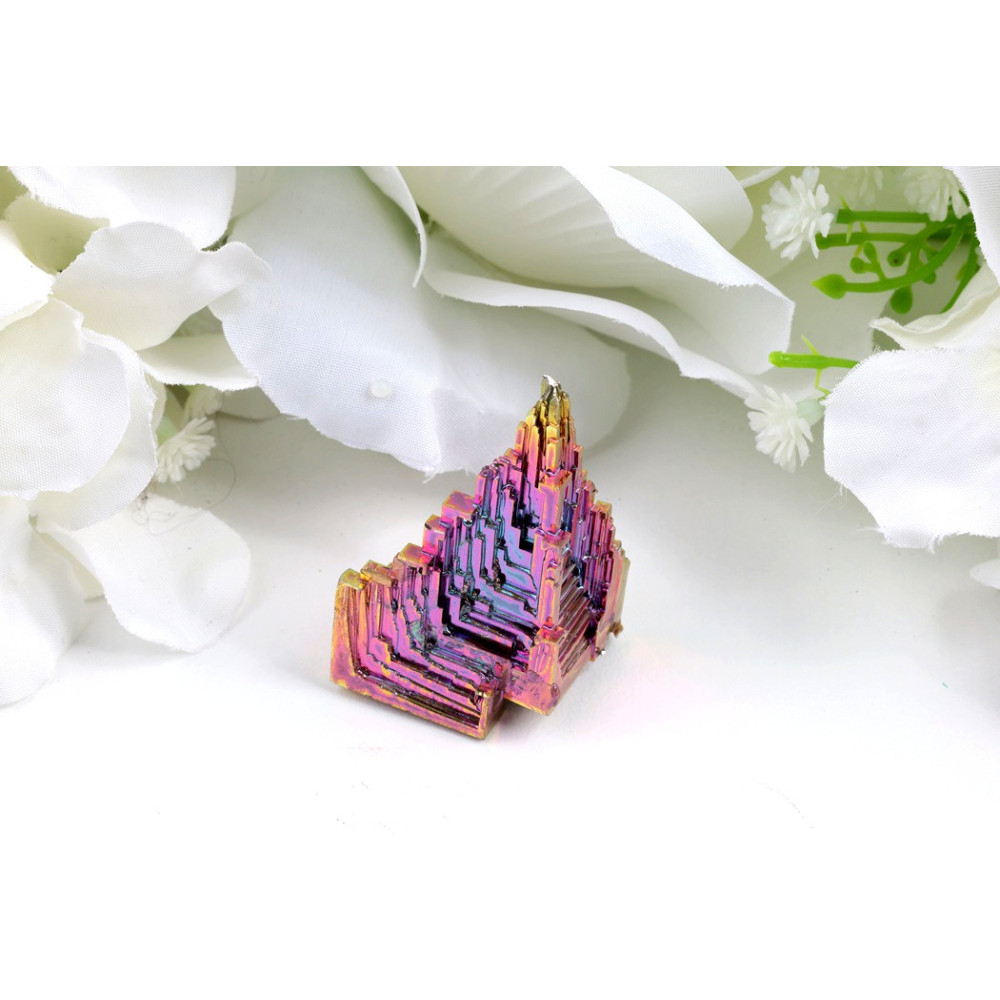 Tento výrobek pochází z uměle pěstovaného bismutového krystalu. Nejde o přírodní surovinu – tvar i zbarvení jsou výsledkem speciálního postupu tavení a pomalého chladnutí kovu.