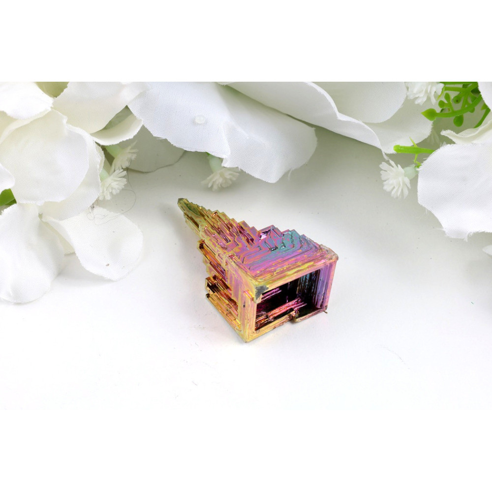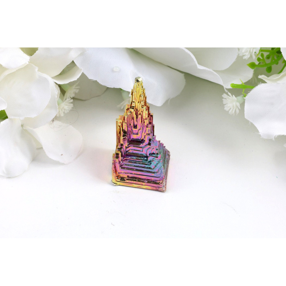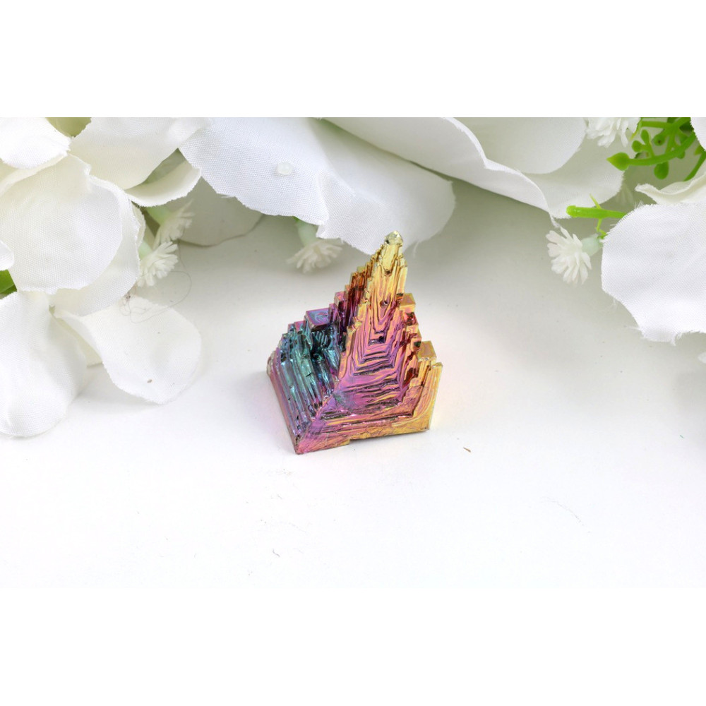 Produkt není přírodní kámen, ale technicky pěstovaný bismutový krystal. Typická duhová barevnost je výsledkem oxidace povrchu, která proběhne po vychladnutí roztaveného bismutu.
