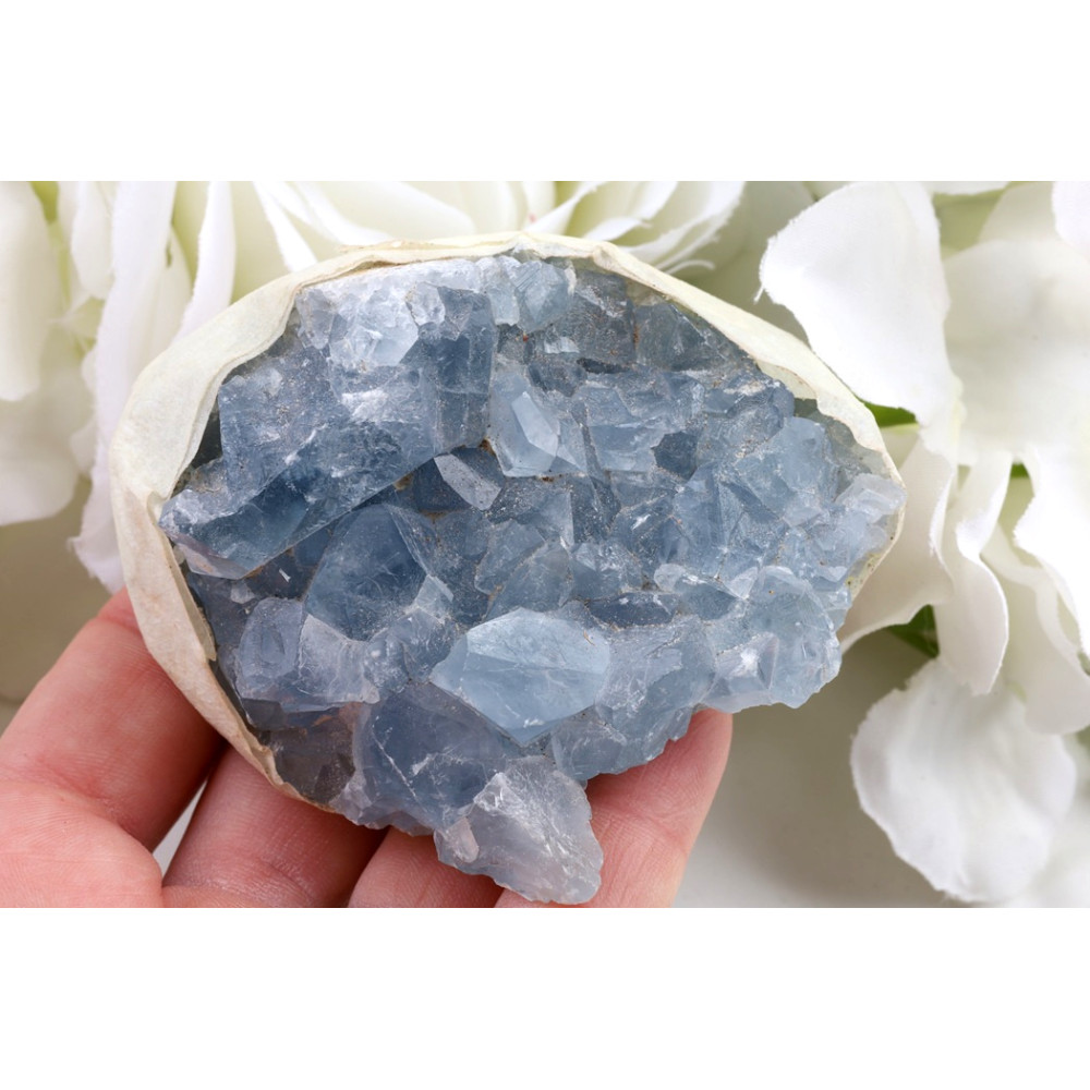 Drúza celestýnu je díky svému éterickému vzhledu a uklidňujícím vibracím výjimečným doplňkem každého prostoru. Představte si ji jako elegantní dekoraci na vašem nočním stolku, kde bude vyzařovat klid a podporovat kvalitní spánek, nebo v obývacím pokoji, kde se stane ústředním bodem, který přitáhne pohledy a rozproudí příjemnou energii. Je ideální pro vytvoření meditačního koutku, kde její jemné modré tóny prohloubí vaše soustředění a pomohou vám nalézt vnitřní mír.