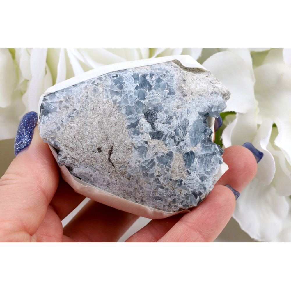 Tato drúza celestýnu okouzlí svou jemnou nebesky modrou barvou, která přechází od světlejších tónů k hlubším odstínům modři, jako by zachycovala kus samotné oblohy. Krystaly jsou převážně drobné, ale nádherně definované, s jasně viditelnými krystalovými plochami, které odrážejí světlo a dodávají celku éterický lesk. Některé z nich se pyšní téměř průhlednou čistotou, zatímco jiné skrývají decentní, mléčný závoj, který prohlubuje jejich mystický vzhled. Spodní část drúzy je tvořena šedavou mateční horninou, která je po stranách částečně obalena ochrannou bílou vrstvou, pečlivě chránící křehké krystaly.