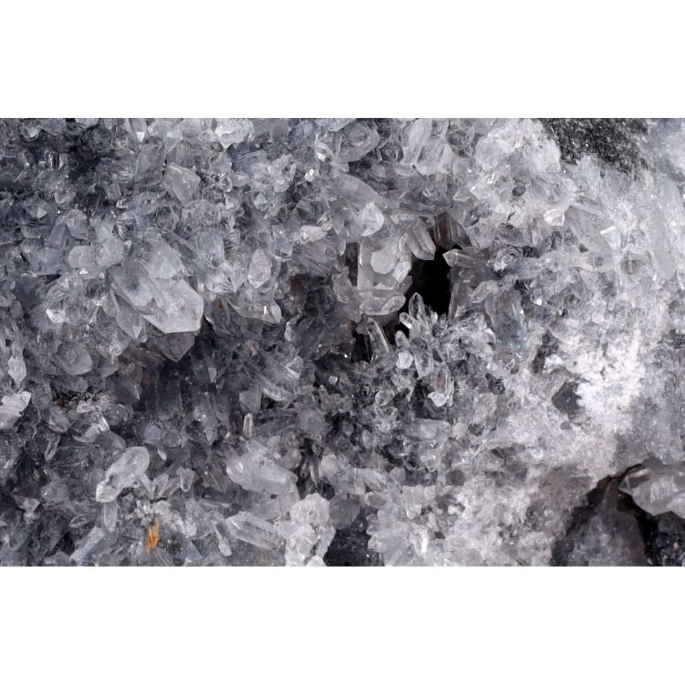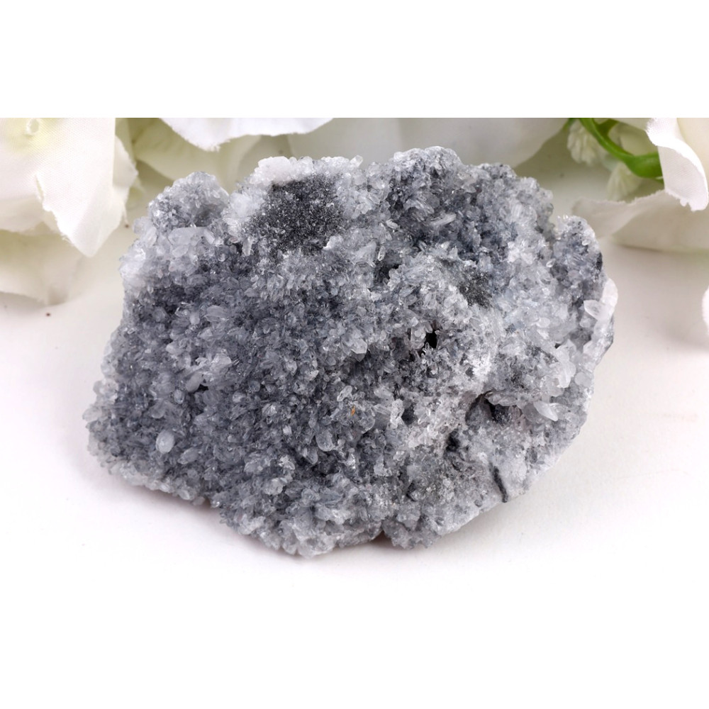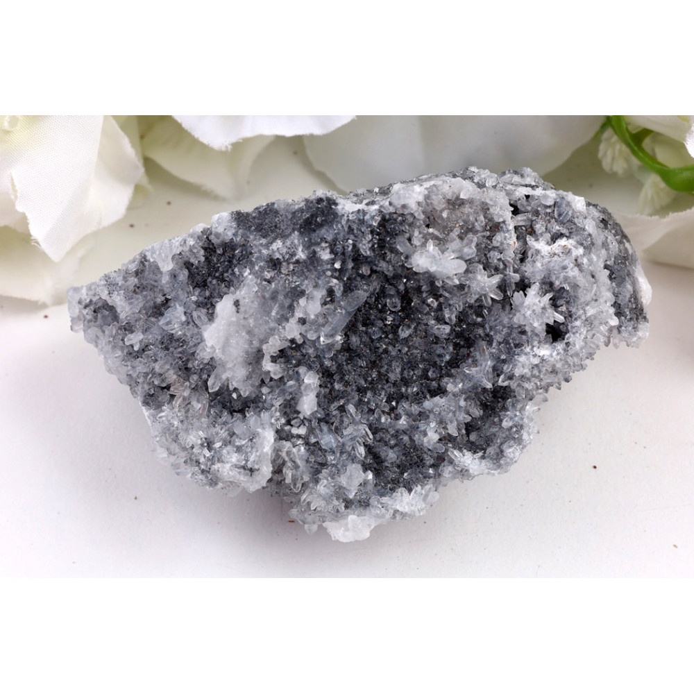 Tento konkrétní surový Chryzantémový kámen č.1501 vás okouzlí svou bohatou texturou a nádhernými detaily. Základem je tmavě šedá až černá matná hornina, ze které vystupují tisíce drobných, světle šedých až bílých krystalků. Tyto krystalky tvoří složité, plošné shluky, které se místy propojují do větších útvarů a připomínají rozkvetlé květy chryzantém. Místy se objevují i hlubší dutinky plné jiskřivých krystalů, které dodávají kameni trojrozměrnost a hloubku.
