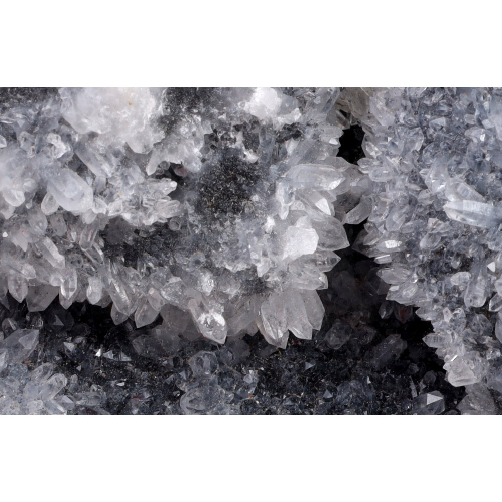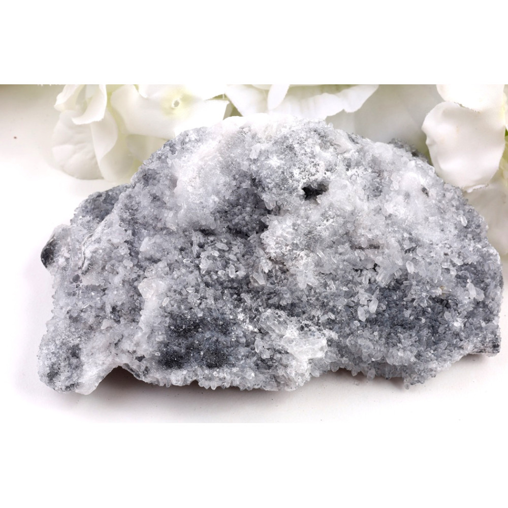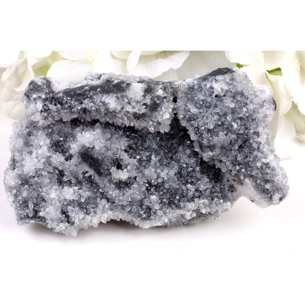 Tento majestátní surový Chryzantémový kámen č.1507 představuje fascinující hru textur a barev. Na jeho matně černém, hrubém podkladu se s elegancí rozprostírají sněhobílé až průsvitné krystalické útvary, připomínající rozkvetlé květy chryzantém. Tyto "květy" jsou tvořeny drobnými, rýhovanými krystaly, které se shlukují do větších rozet a vytvářejí malebné, trojrozměrné vzory po celém povrchu kamene. Detailní záběr odhaluje jemné nuance šedých odstínů mezi černou a bílou, a místy i drobné, lesklé inkluze, které dodávají kameni hloubku a jiskru.