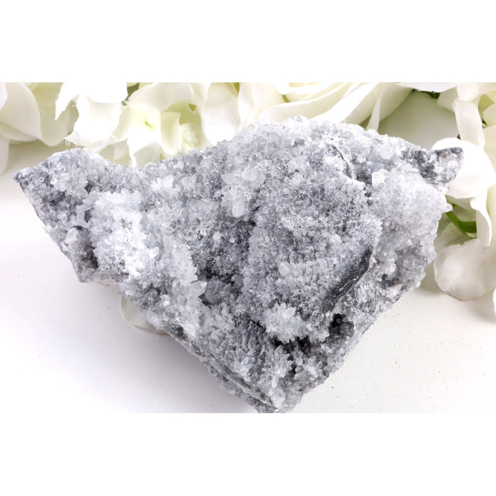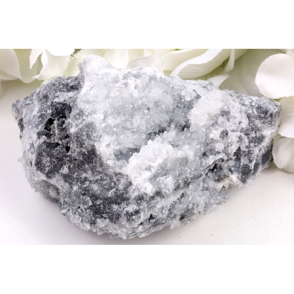 Tento konkrétní exemplář surového Chryzantémového kamene č.1510 upoutá pozornost svou robustní formou a výraznou kresbou. Na jeho temně šedém až černém podkladu se elegantně rozprostírají sněhobílé krystalické struktury, které připomínají rozkvetlé chryzantémy. Některé z těchto "květů" jsou matné a působí jako něžné shluky sněhových vloček, zatímco jiné se třpytí drobnými krystalky, které odrážejí světlo.