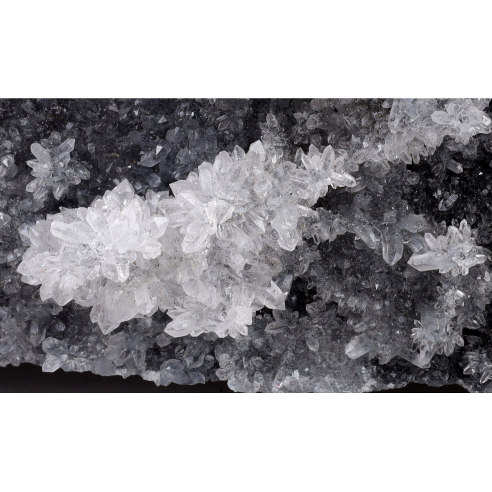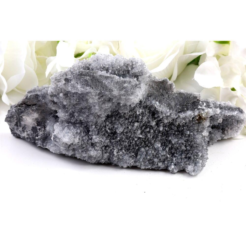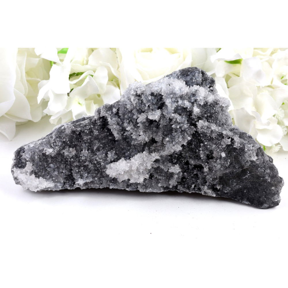 Tento unikátní surový kus se prezentuje jako masivní, drsná textura tmavě šedého až černého podkladu, z něhož vystupují nádherné, jasně bílé „květy“ krystalů. Některé krystalické útvary jsou drobné a husté, tvořící měkčí, sametový dojem, zatímco jinde se objevují větší, ostřeji definované krystaly, které jako by rozkvétaly z kamenného lůna. Na povrchu lze pozorovat jemné odlesky světla, které zdůrazňují jedinečnou krystalovou strukturu a propůjčují kameni zvláštní jiskru.