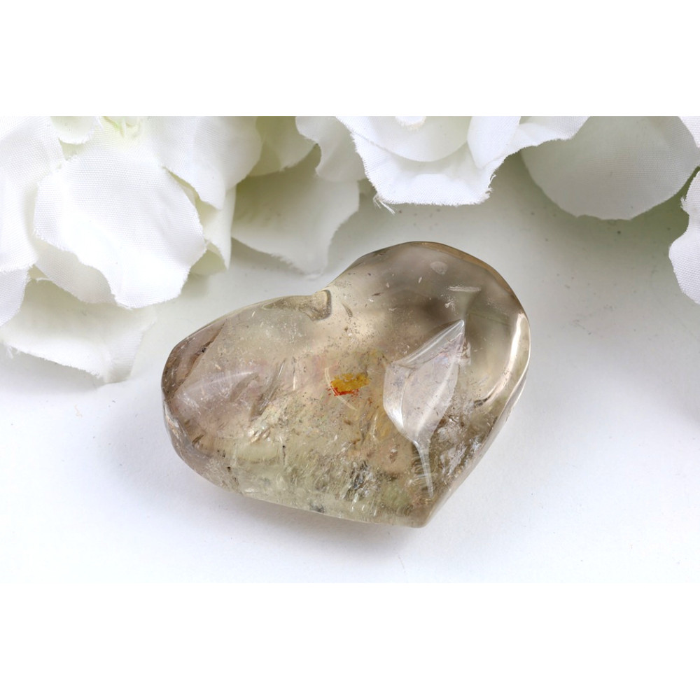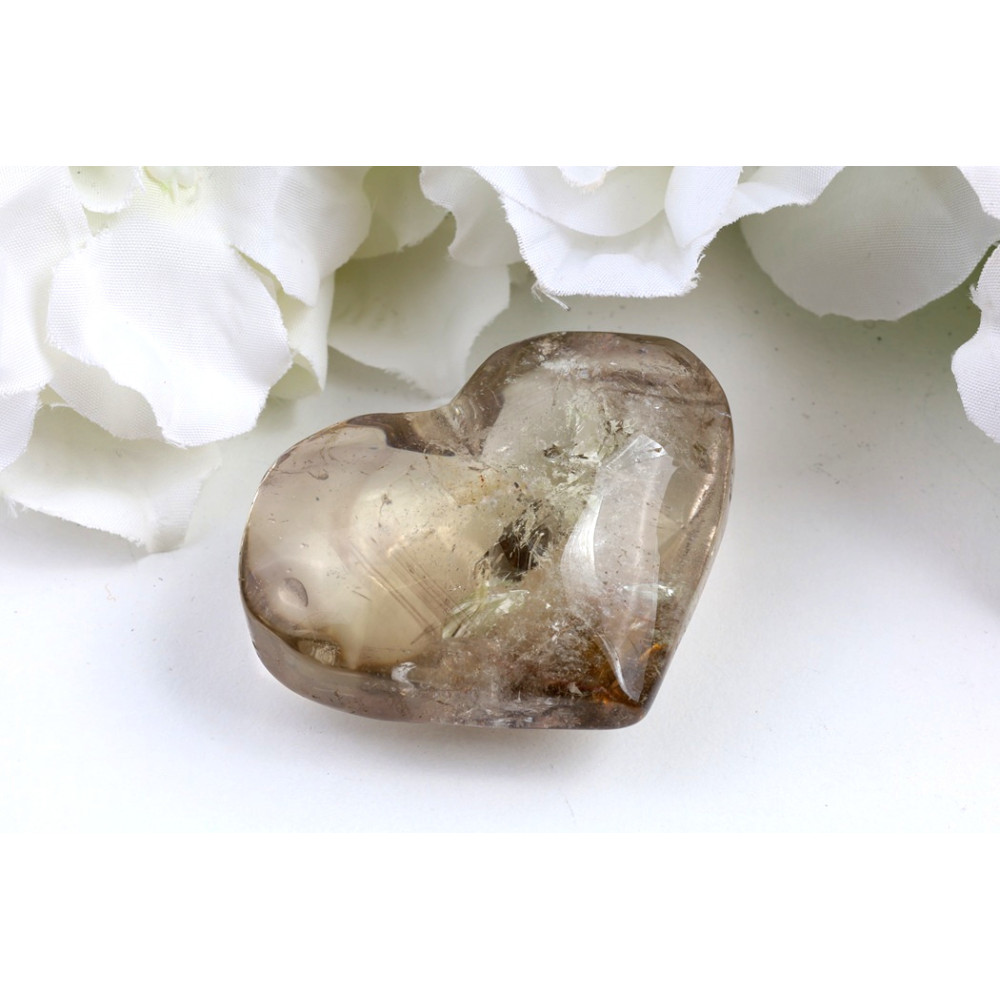 Toto srdce z citrínu, kus číslo 1531, se pyšní podmanivou, medově zlatavou barvou, která přechází do jemných kouřových odstínů. Jeho hladký, do dokonalosti vyleštěný povrch s krásně zaoblenými hranami vybízí k doteku a prohlížení. Uvnitř kamene lze pozorovat fascinující vnitřní inkluze a přirozené trhlinky, které vytvářejí jedinečnou hru světla a odlesků, jako by se v něm ukrývaly praskliny vyplněné tekutým zlatem. Jeden z úhlů odhaluje drobné, avšak výrazné oranžovo-červené zabarvení, které dává tomuto kousku nezaměnitelný charakter a osobitost, zatímco na jedné straně se jeví mírně průzračnější, odhalující hlubší vrstvy.