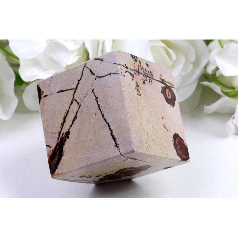 Tato kostka z obrázkového jaspisu zaujme na první pohled svou jedinečnou kresbou. Základní barva je jemně růžově-béžová až světle mahoganová, protkáná výraznými černými dendritickými kresbami, které připomínají abstraktní krajinné motivy nebo umělecké černobílé fotografie. Každý úhel kostky nabízí jiný přírodní obraz, díky čemuž se jedná o unikátní kus s vysokou dekorativní hodnotou. Povrch je hladce broušený s matným až jemně lesklým povrchem, který podtrhuje krásu přírodní kresby kamene.