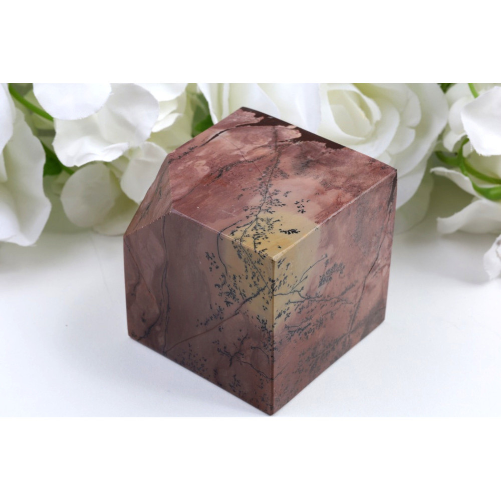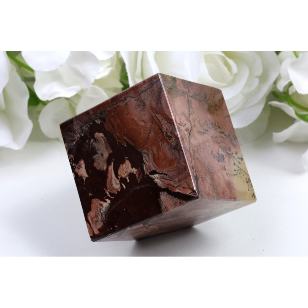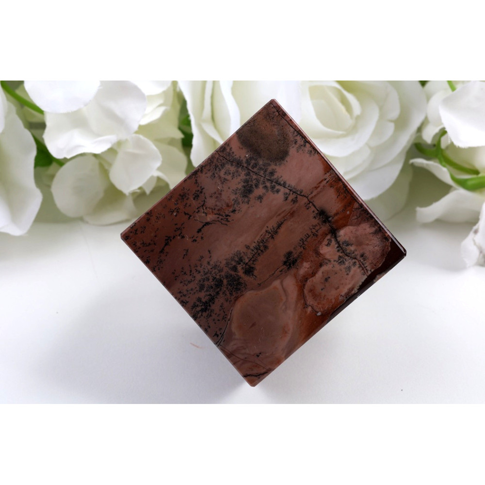 Tato nádherná kostka z obrázkového jaspisu je skutečným uměleckým dílem přírody. Povrch kamene zdobí červenohnědá až mahagonová základní barva, která je protkána černými tečkami a dendritickými vzory připomínajícími krajinu nebo abstraktní malbu. Každá strana kostky nabízí jiný jedinečný pohled na přírodní kresbu minerálu. Kámen je precizně opracován do dokonalé kubické formy a povrch je pečlivě leštěn do vysokého lesku, který zvýrazňuje hloubku barev a kreseb.