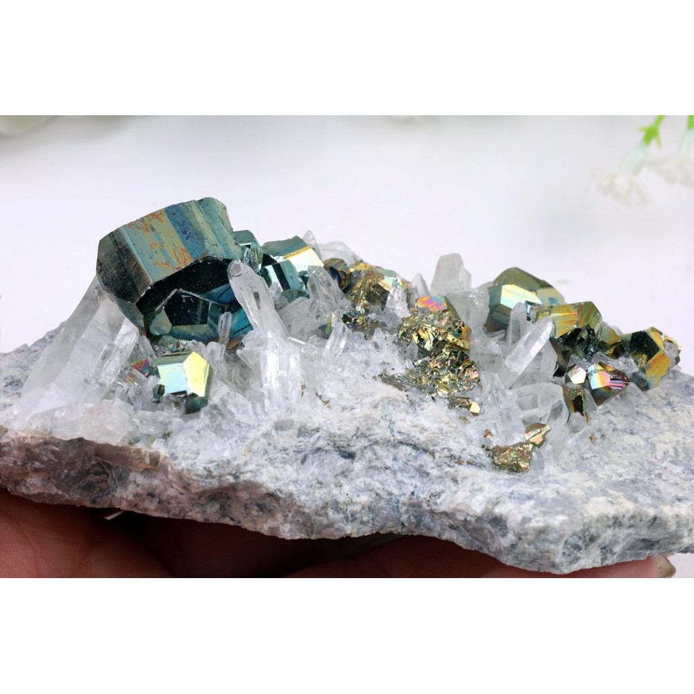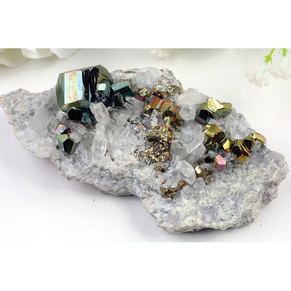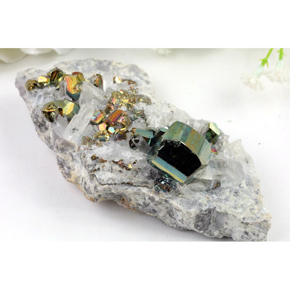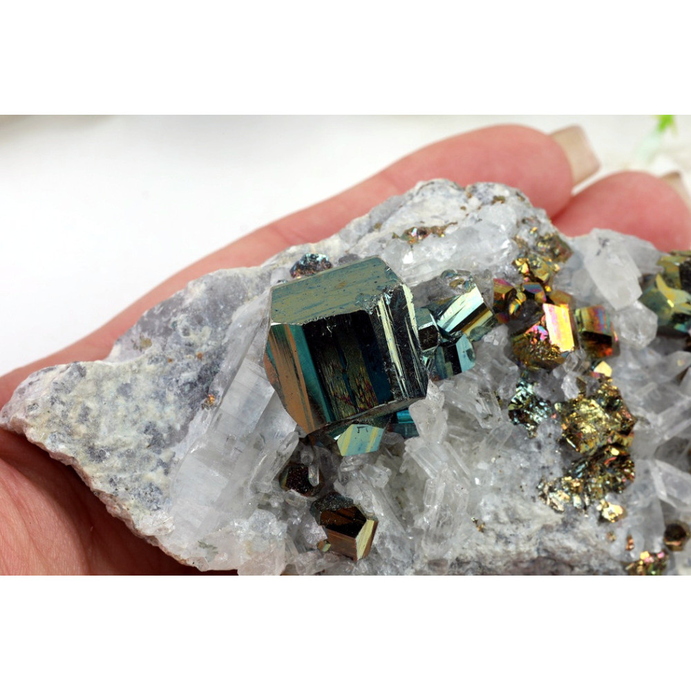 Tento protáhlý plochý kus vyniká svým výrazným uspořádáním kubických pyritových krystalů. Zlatavě mosazný povrch krystalů je ozdoben fascinujícími duhovými odlesky v odstínech fialové, modré a zelené barvy, které se mění podle úhlu dopadu světla. Krystaly jsou pevně usazeny v bílé až béžové křemenné matrici s jemnou strukturou, která vytváří efektní kontrast se zlatavým leskem pyritu. Celkový tvar je elegantně protáhlý s plochým profilem, což z něj činí ideální kus pro prezentaci i studium.