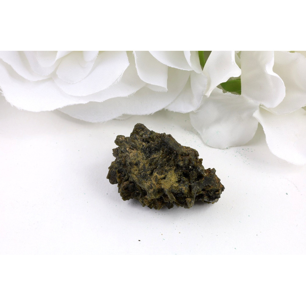 Tento exemplář epidotu se prezentuje v kompaktním, nepravidelném tvaru s výraznou tmavě olivově zelenou až hnědavou barvou. Povrch kamene je přírodní a neupravený, s matným leskem a viditelnými krystalickými plochami, které prozrazují jeho autentický původ z horských oblastí Pákistánu. Kámen má pevnou strukturu a viditelné přírodní lomy, což potvrzuje jeho geologickou historii.