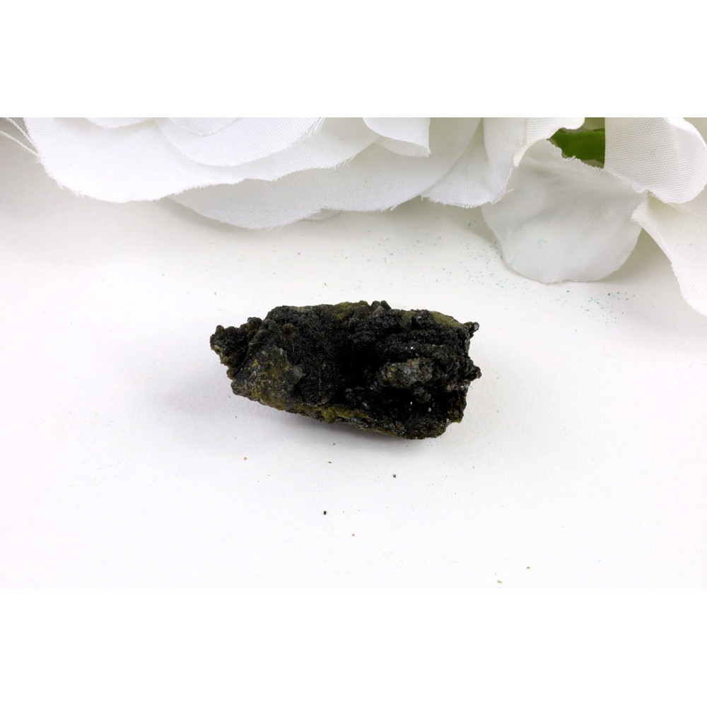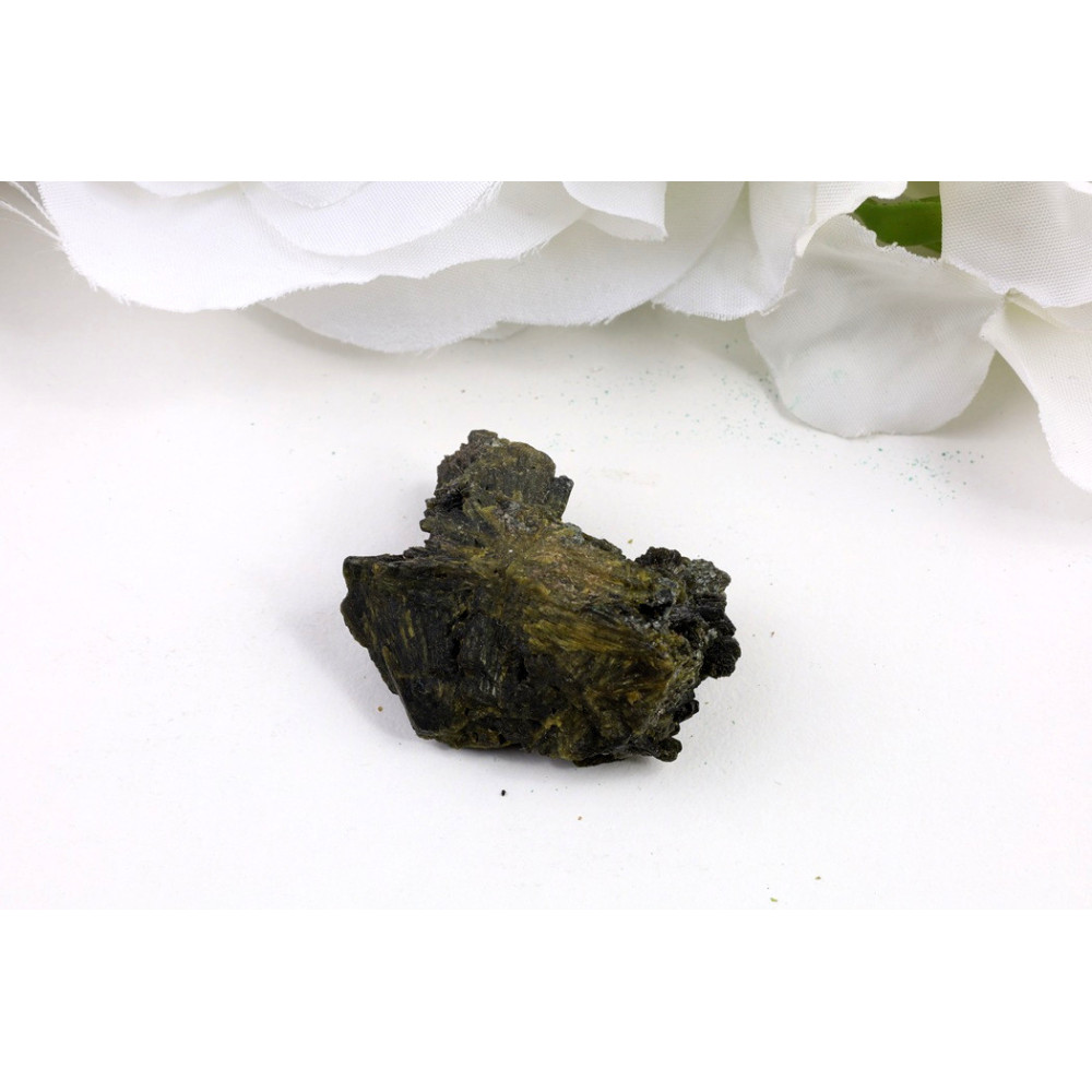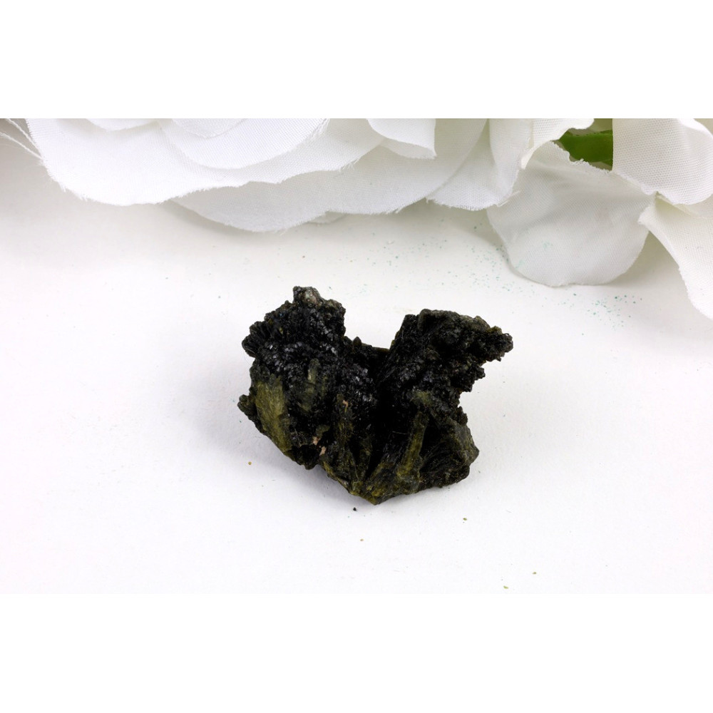 Tento surový epidot se vyznačuje tmavou, téměř černou barvou s výrazným olivově zeleným nádechem, který je typický pro kvalitní kusy z této lokality. Povrch kamene má intenzivní kovový lesk, který dodává minerálu elegantní a tajemný vzhled. Kámen má kompaktní krystalický tvar s hrubými hranami a přirozenými strukturami, které zdůrazňují jeho autentický původ. Jedná se o originální surový kus bez úprav, vhodný jak pro sběratele, tak pro osobní použití.