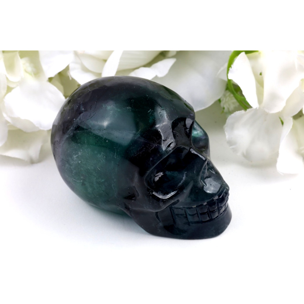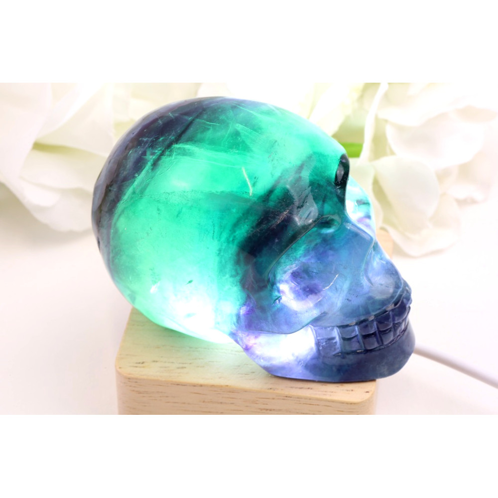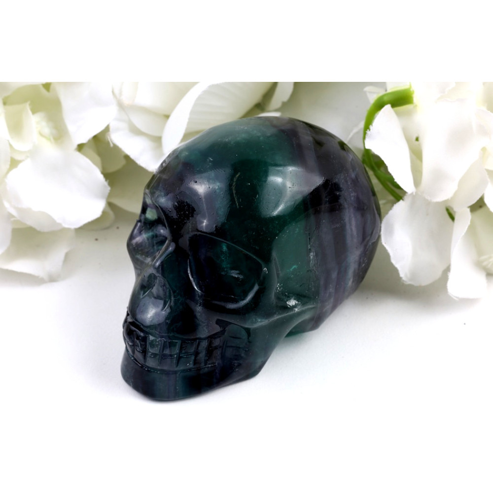 Tato konkrétní lebka z fluoritu pochází z prosluněných dolů Brazílie, země známé svými bohatými nalezišti drahokamů a minerálů. Zde, hluboko v zemi, vznikal fluorit po miliony let pod tlakem a teplem, pomalu krystalizoval a nabýval svých fascinujících barevných vrstev. Z těchto hlubin je kámen pečlivě těžen a poté putuje do rukou zkušených řemeslníků, kteří jej s precizností tvarují do této mystické podoby lebky. Každý krok – od objevu v zemi až po finální leštění – vypráví příběh o zemských procesech a lidské zručnosti.