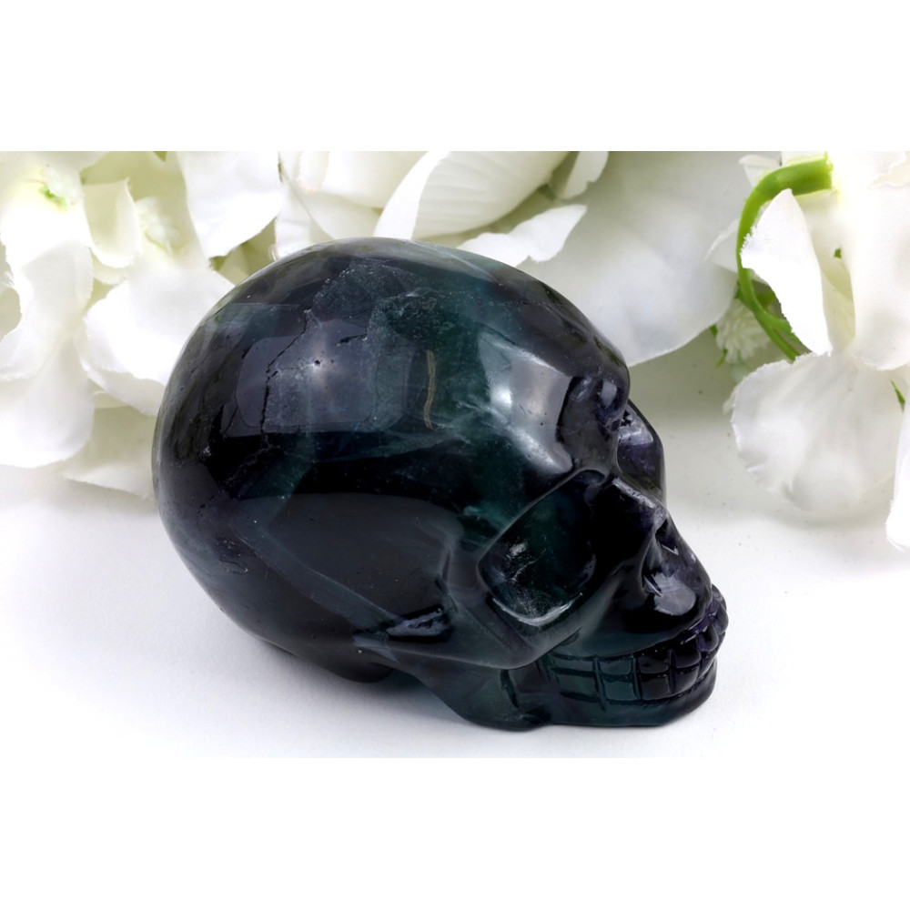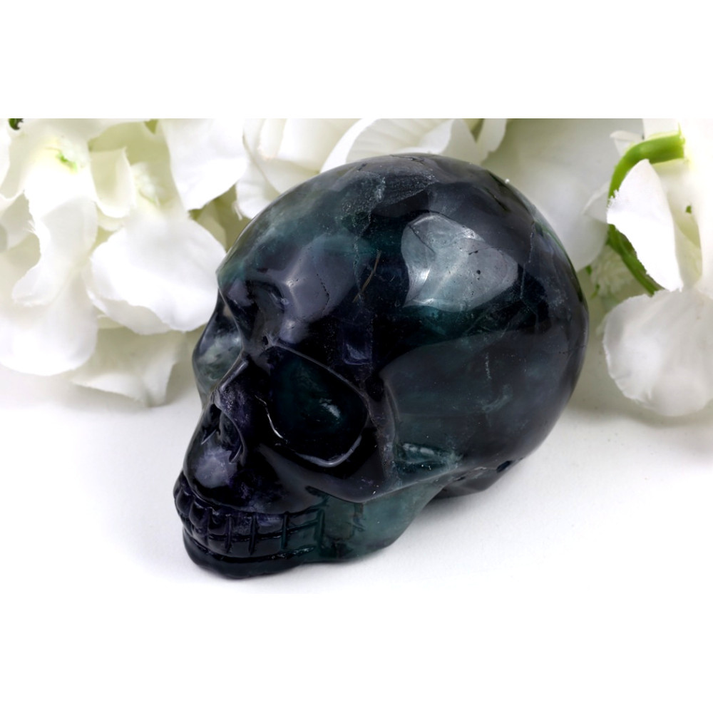Ponorte se do tajemného světa fluoritu s touto mistrně vyřezanou lebkou, která ztělesňuje moudrost a klid.