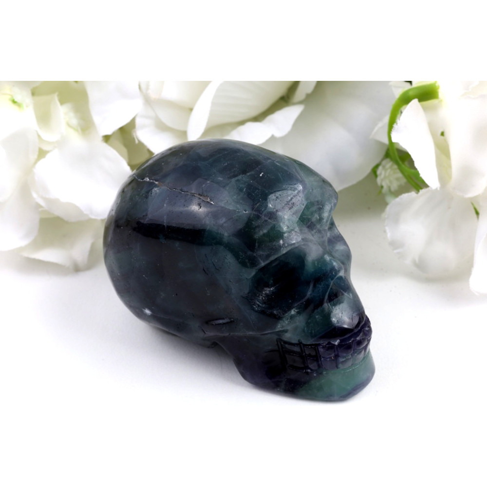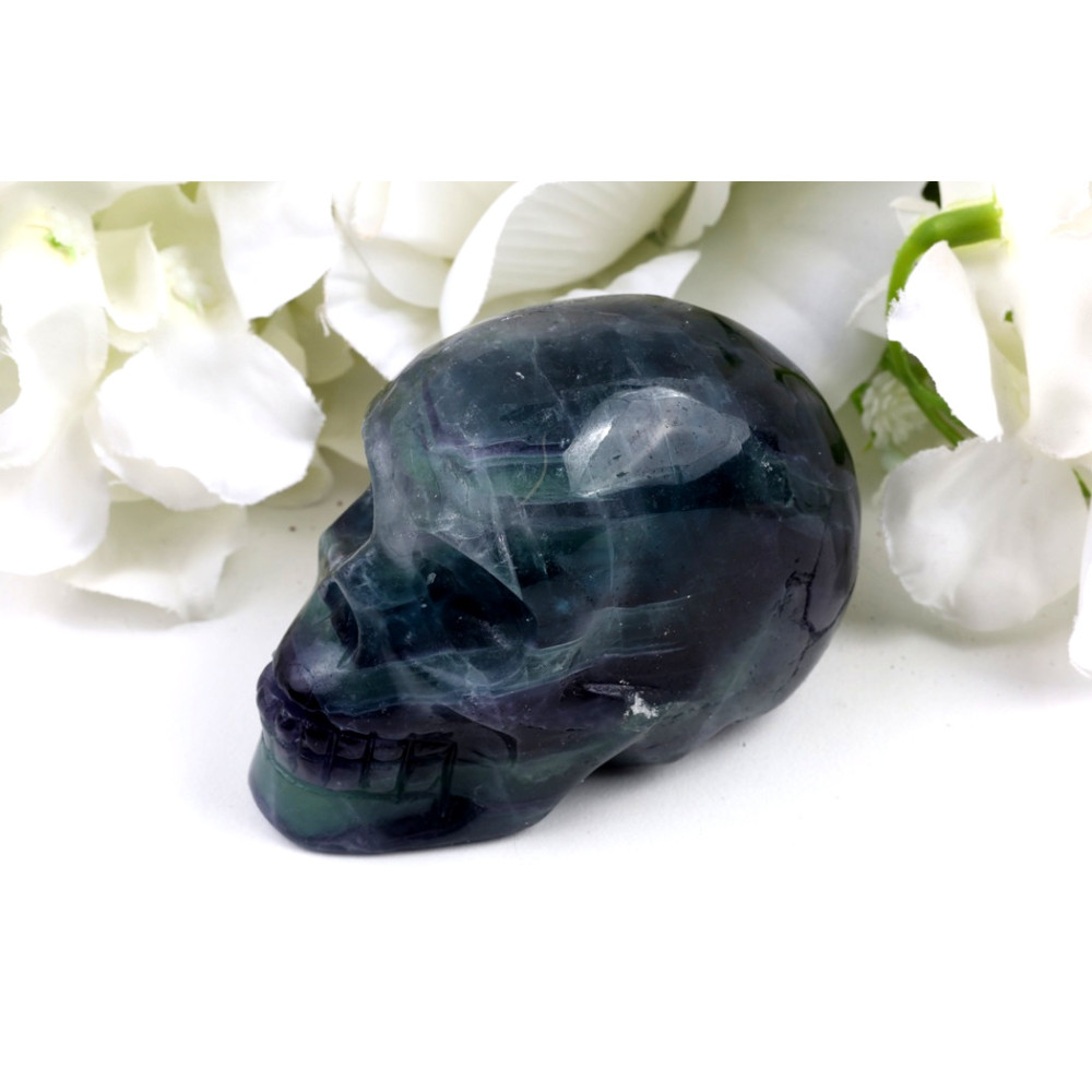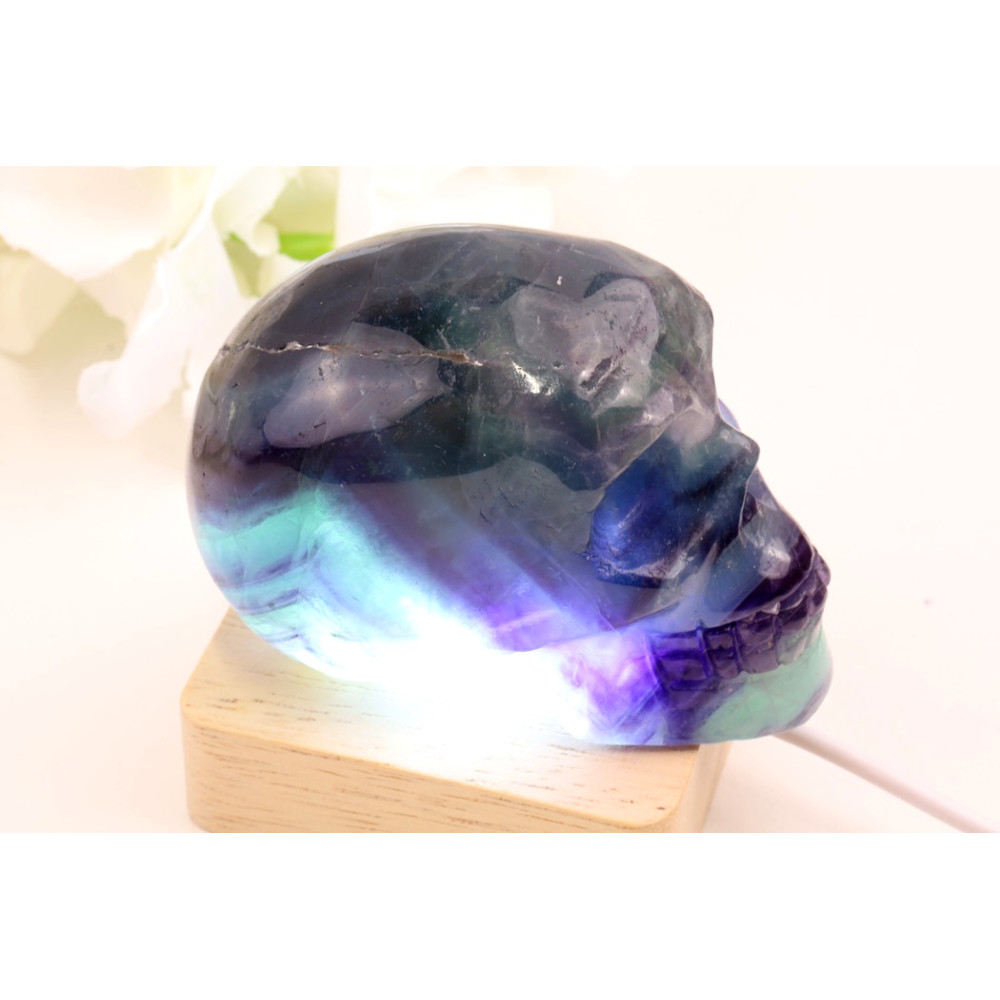 Tato fascinující lebka je mistrným dílem přírody i lidského umu. Při běžném světle se ukazuje v temně modrozelených a fialových tónech, které se elegantně prolínají a vytvářejí dojem hluboké, prastaré moudrosti. Vnímáme zde jemné, ale zřetelné proužkování a vrstvení, které je pro fluorit tak charakteristické, a propůjčuje každému kusu nezaměnitelnou texturu. Detaily lebky, jako jsou oční důlky a čelistní kosti, jsou pečlivě vyřezány, což podtrhuje její mystický charakter.